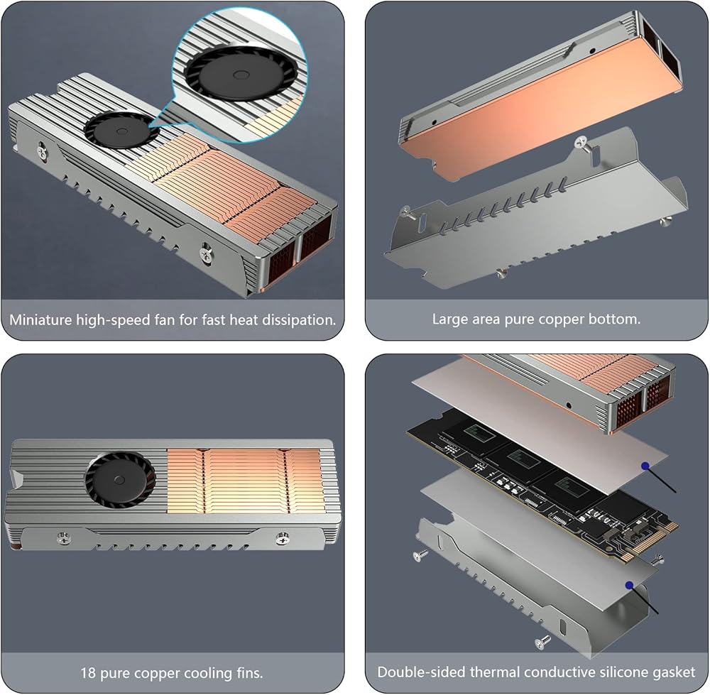 【مروحة تبريد صغيرة】تتمتع هذه المروحة الصامتة عالية السرعة بأقصى سرعة تصل إلى 10,000 دورة في الدقيقة. يحافظ تصميم الزعانف الإلكترونية النحاسية النقية على برودة القرص الصلب M.2 SSD.