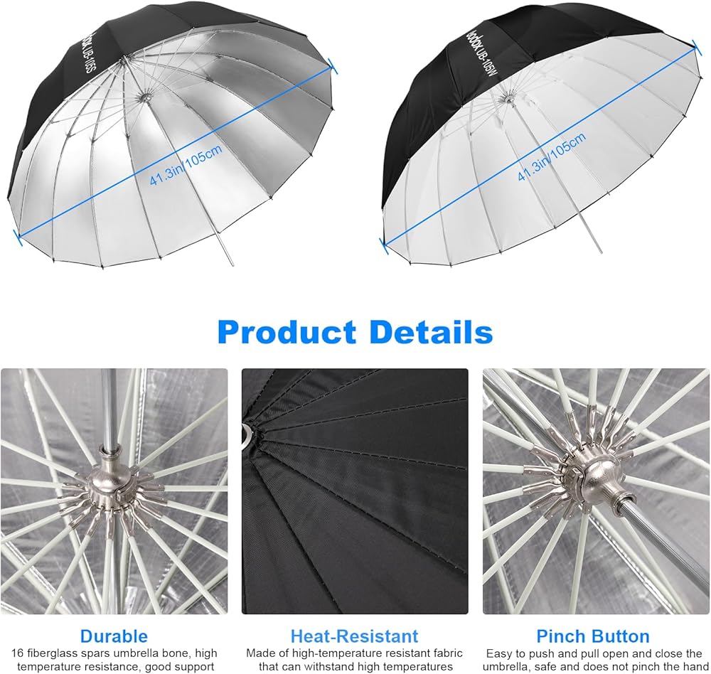 غودوكس مظلة عاكسة بعمق 41.3 انش 105 سم مع بطانة داخلية فضية UB-105S وUB-105W داخلية بيضاء للتصوير الفوتوغرافي لتصوير استوديو الفيديو من قطعتين