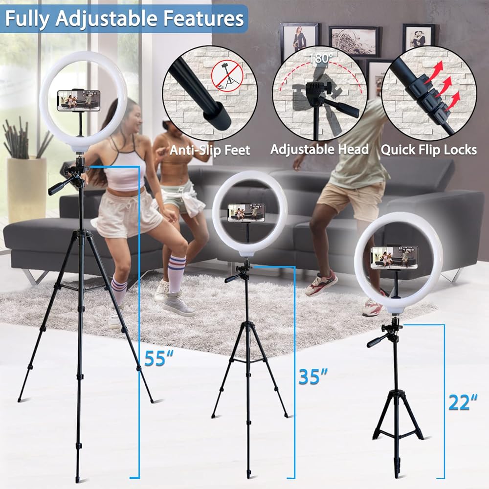 حلقة إضاءة سيلفي مقاس 12 بوصة من فوجيتيك مع حامل ثلاثي من الألومنيوم قابل للتمديد مقاس 54 بوصة، جهاز تحكم عن بعد بلوتوث لاسلكي، حامل هاتف، للبث المباشر للفيديو والصور والمكياج و3 أوضاع ألوان، يعمل بمنفذ USB