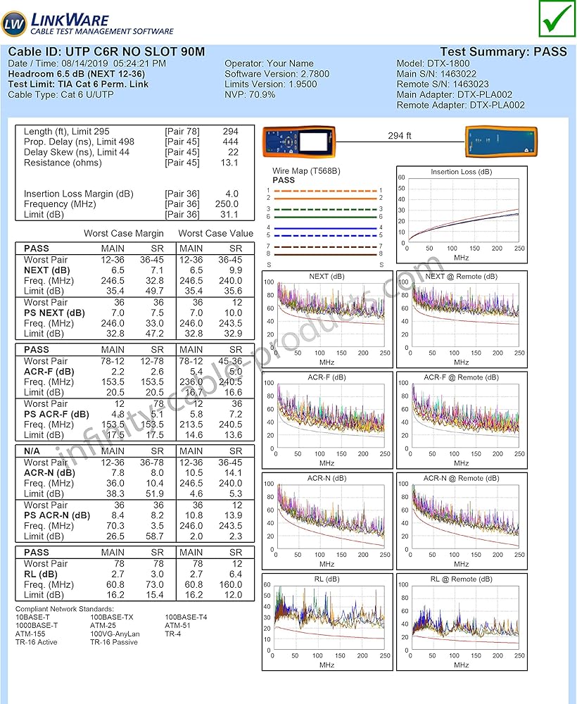 الكابل: كابل Cat6 Riser (CMR) باللون الأخضر هو 23AWG، 1000 قدم، 4 أزواج ملتوية غير محمية (UTP)، موصلات نحاسية صلبة للحصول على قوة إشارة مثالية. هامش إضافي 3-5 ديسيبل مقارنة بمعايير EIA/ TIA-568.2-D. مناسب لـ PoE وPoE+. إذا كنت تفضل الإنهاء بدون شريحة، فهذا هو الكابل المناسب لك. احصل على أداء Cat6 بدون شريحة مع إضافة المزيد من العزل حول الأزواج للحصول على أداء أفضل ضد التداخل. تم اختبار Cat6 الخاص بنا باستخدام محلل الكابلات Fluke DSX-8000 Versiv.