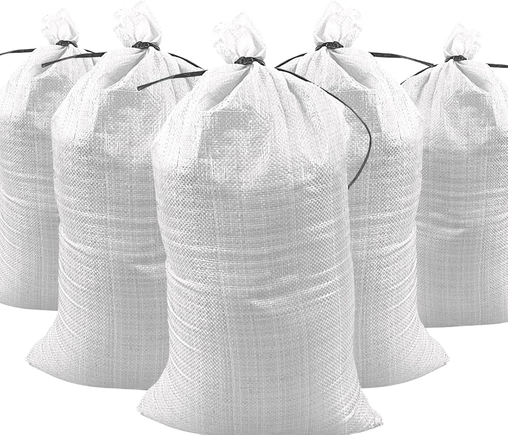 أكياس رمل متينة من دوراساك مع أربطة ربط أكياس رمل بولي بروبيلين منسوجة فارغة للتحكم في الفيضانات مع 1600 ساعة من الحماية من الأشعة فوق البنفسجية، سعة 50 رطل، 14 × 26 بوصة، أبيض، عبوة من 50