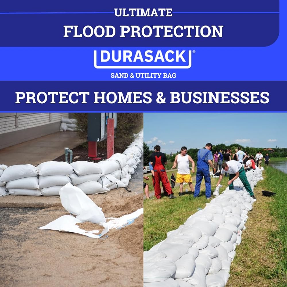 حماية فائقة من الفيضانات والعواصف: قمنا بتصميم أكياس رمل DURASACK للحفاظ على منزلك وعملك آمنًا من الفيضانات. تتميز أكياس الرمل هذه بأنها قابلة للحمل، وسهلة الملء بسعة 50 رطلاً، وفعالة كمكعبات بناء عندما تحتاج إلى سد سريع أو حاجز فيضان. تعتبر مجموعة DURASACK Sand Bag للبيع بالتجزئة أمرًا ضروريًا لمجموعة الاستعداد للكوارث والطوارئ على مدار العام