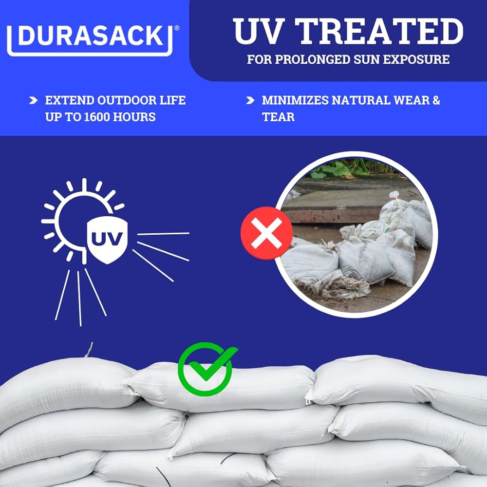 أقوى المواد: تم تصميم حقائب الرمل المنسوجة من مادة البولي بروبيلين لتتحمل العناصر. تتم معالجة جميع حقائب الرمل وسلاسل الربط شديدة التحمل من DURASACK بمانع للأشعة فوق البنفسجية حتى تتمكن من البقاء سليمة بعد التعرض لأشعة الشمس لفترة طويلة.
