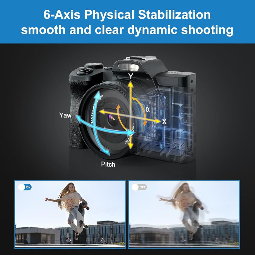 【ضبط تلقائي للصورة وتثبيت 6 محاور】تم تجهيز هذه الكاميرا بنظام تركيز تلقائي دقيق يثبت الهدف بسرعة، مما يبقيه في تركيز حاد سواء كنت تقوم بتصوير مشاهد رياضية أو صور شخصية. وفي الوقت نفسه، سواء كنت تقوم بتصوير صور ثابتة أو صور متحركة عالية الدقة، فإن وظيفة التثبيت سداسية المحاور تقلل بشكل فعال من مشاكل عدم الوضوح المرتبطة بالتصوير المحمول باليد. حتى عند التصوير في ظروف الإضاءة المنخفضة أو التعرض الطويل، تظل الصورة ثابتة وواضحة.