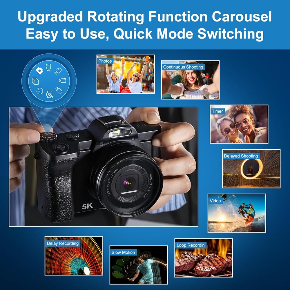 【تبديل وضع التصوير وضمان ما بعد البيع】تم تصميم الأزرار الدوارة الموجودة على هذه الكاميرا الرقمية لتسهيل التبديل بين أوضاع التصوير المختلفة - الصورة، وصورة متتابعة، وصورة مؤقتة، وصورة تأخير؛ فيديو، تسجيل متكرر، فيديو بطيء الحركة، تأخير التسجيل. تشتمل هذه الكاميرا بدقة 5K على بطاقة SD سعة 32 جيجا بايت وبطاريتين قابلتين لإعادة الشحن، ونقدم ضمانًا لمدة تصل إلى عام واحد، لذا إذا كانت لديك أي مشكلات، فلا تتردد في الاتصال بنا.