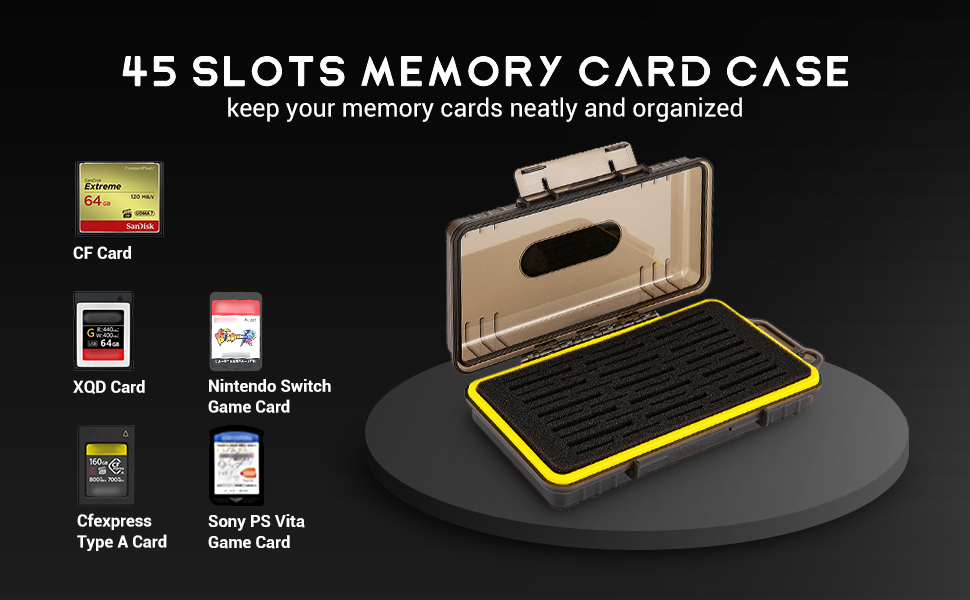 [تصميم 45 فتحة]: تتميز الإسفنجة المصبوبة بإجمالي 45 فتحة تحمل بطاقات الذاكرة بشكل أنيق ومحكم. يمكنه تخزين 15 بطاقة CF/XQD و30 بطاقة SD / SDHC / SDXC / بطاقة ألعاب نينتندو سويتش / بطاقة ألعاب Sony PS Vita / بطاقة CFexpress Type A.