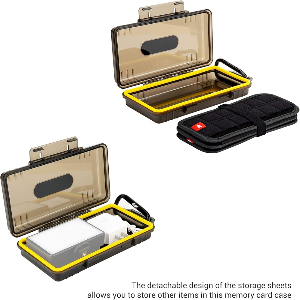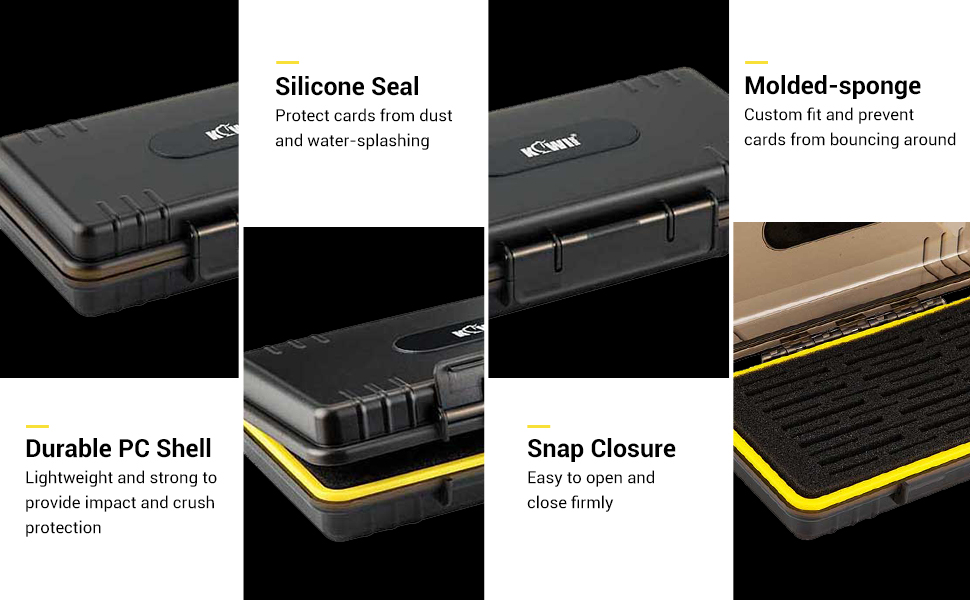 [الحماية]: الجزء الخارجي مصنوع من مادة البولي كربونات عالية القوة وصديقة للبيئة، ويحمي البطاقات من الغبار والرطوبة ورذاذ الماء. يتكون بداخله من إسفنجة مصبوبة حيث يمكن حفظ بطاقات الذاكرة بأمان في حجرات محددة وتقليل الصدمات.