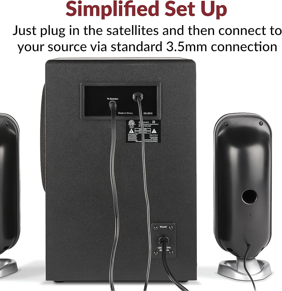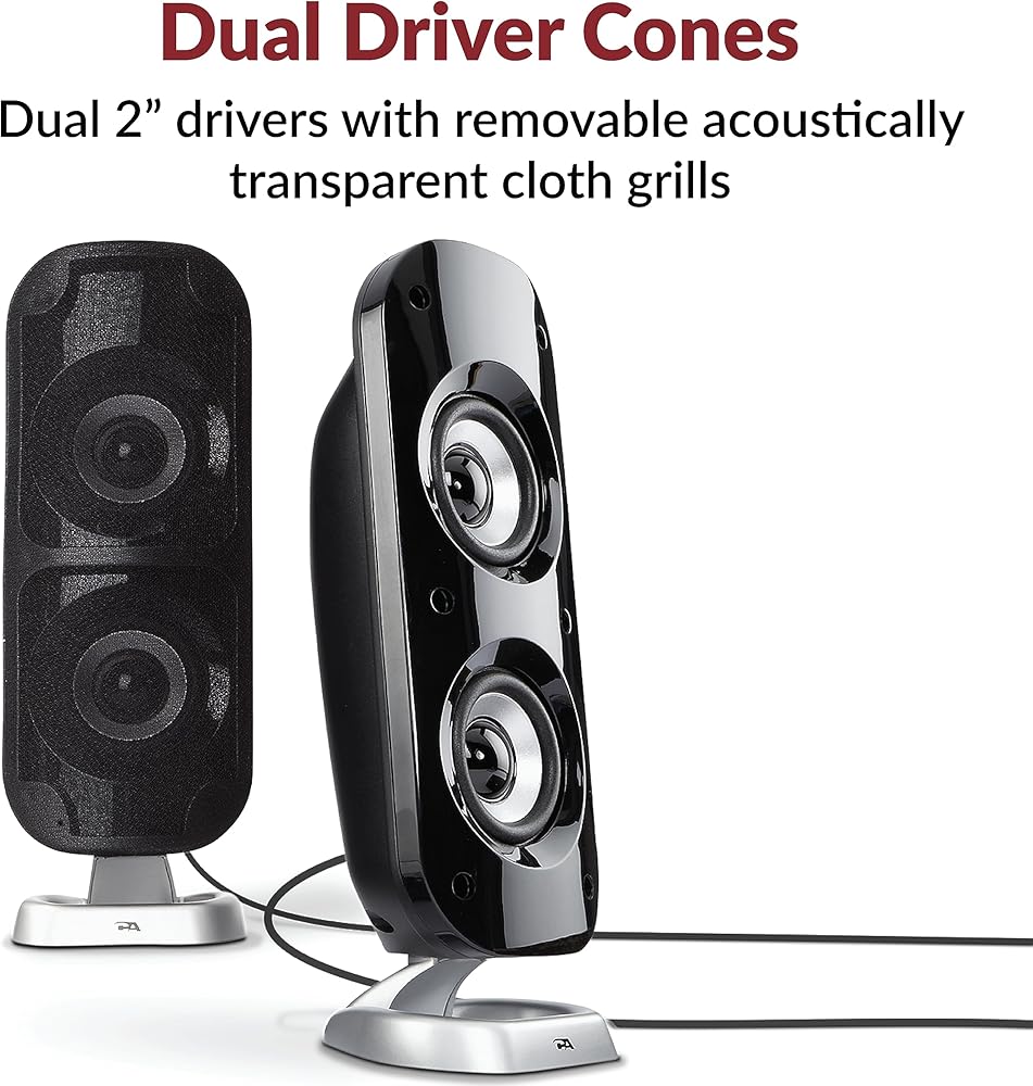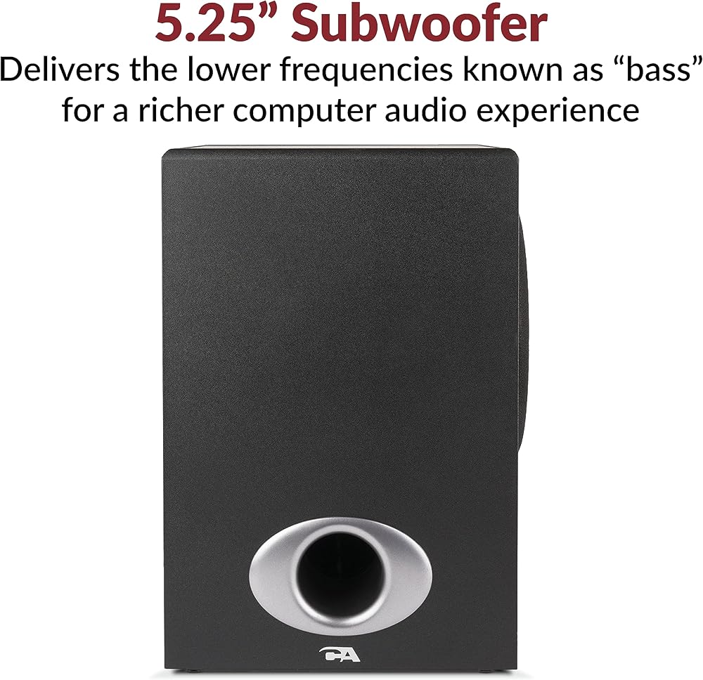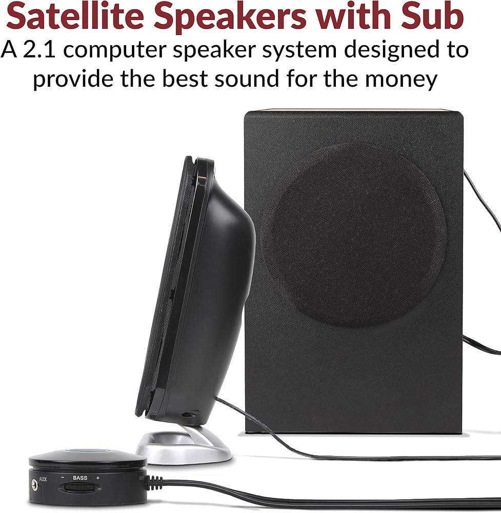 صوت عالي الجودة - توفر مكبرات الصوت 2.1 مع مضخم الصوت طاقة ذروة تبلغ 62 وات و30 وات RMS. يتميز كل قمر صناعي بمحركات مزدوجة من التيتانيوم مقاس 2 بوصة توفر مستويات عالية واضحة ونغمات متوسطة دافئة بينما يعمل مضخم الصوت مقاس 5.25 بوصة مع منفذ مضبوط على توفير صوت جهير عميق وقوي للحصول على موسيقى أو أفلام أو ألعاب ممتازة.