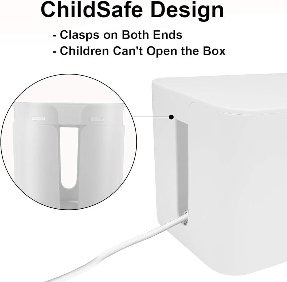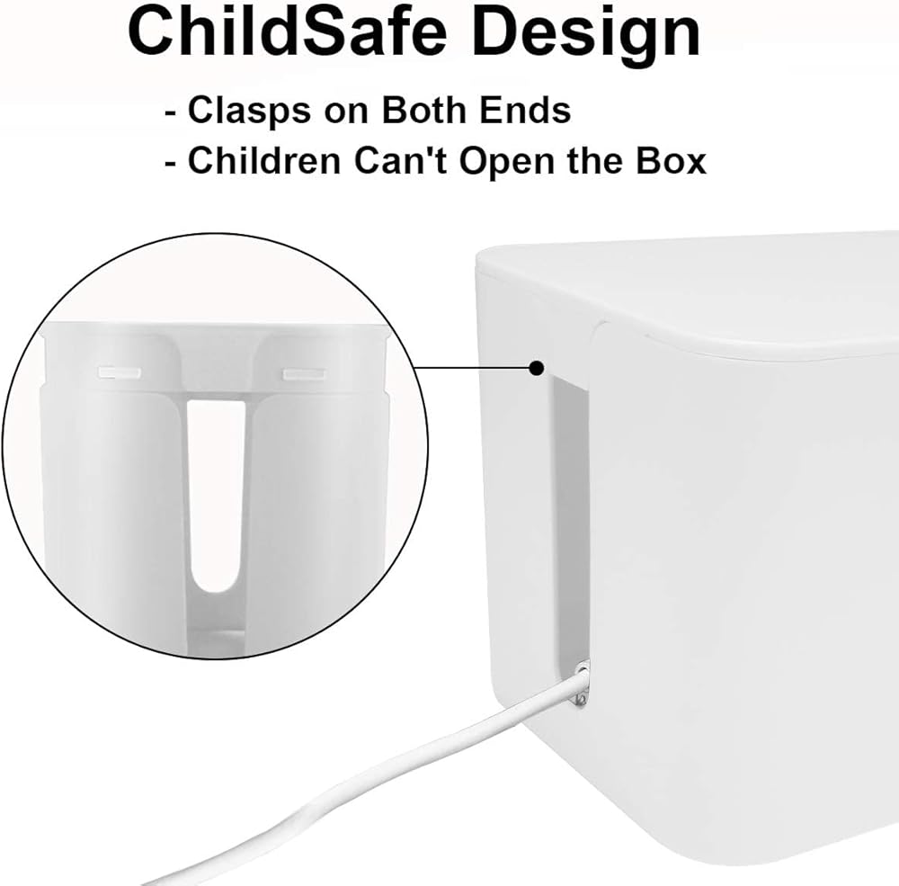 • تصميم آمن على الأطفال - يقوم صندوق منظم الكابلات بتخزين وإخفاء المقابس والأسلاك وشرائط الطاقة والأسلاك الخطرة. تم تصميمه بمشابك على كلا الطرفين لمنع الأطفال من فتحه، وحماية الأطفال والحيوانات الأليفة من شرائح الطاقة والمعدات الكهربائية الأخرى.