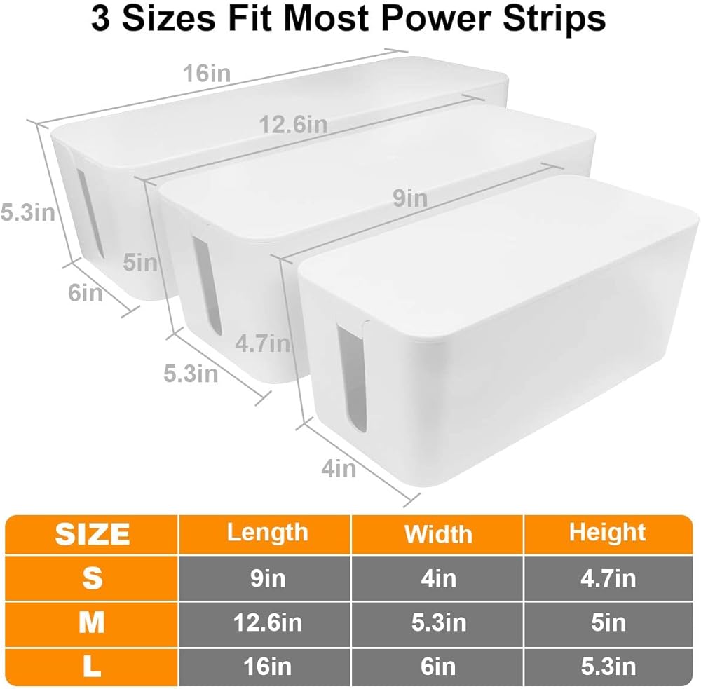 • 3 أحجام مختلفة - يأتي صندوق إدارة الكابلات بمقاس كبير (16 بوصة × 6 بوصة × 5.3 بوصة)، ومتوسط ​​(12.6 بوصة × 5.3 بوصة × 5 بوصة)، وصغير (9 بوصة × 4 بوصة × 4.7 بوصة). إنها تناسب معظم الأشخاص أحجام شرائح الطاقة ولها مساحة تخزين كبيرة لتخزين جميع أجهزة المنافذ، بما في ذلك شرائح الطاقة المتعددة والأسلاك والمحولات والمقسمات والمزيد.