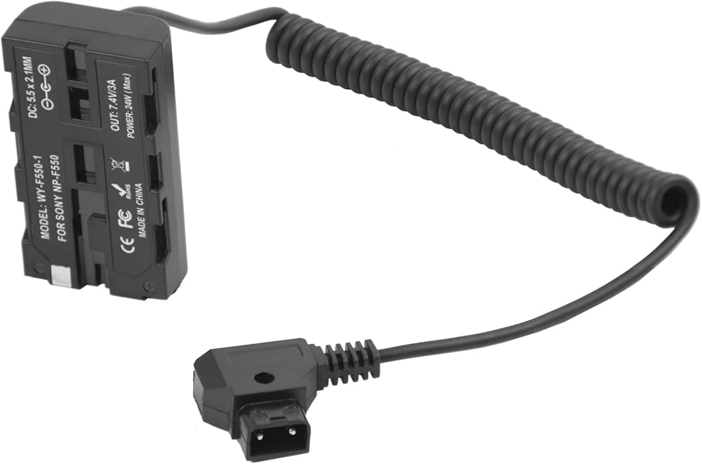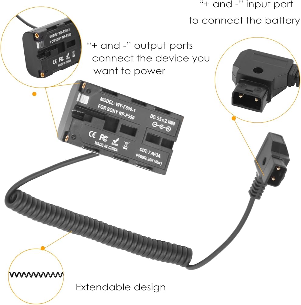 كابل طاقة ملفوف على شكل حرف D إلى بطارية الدمية NP-F550 متوافق مع سوني NP-F550/770/570 NP-F970، ضوء LED للطاقة، شاشة Feelworld Atomos Ninja/Shinobi لبطارية تركيب على شكل V