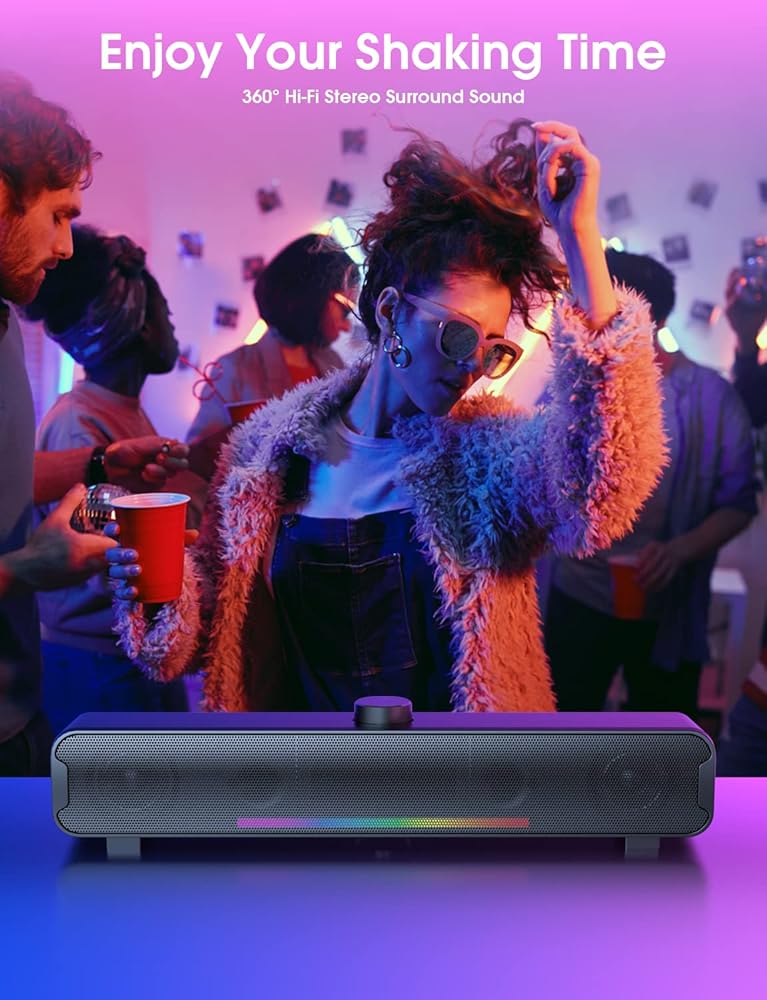 【6 إضاءة LED ديناميكية بالفضاء اللوني ار جي بي】 يعتمد مكبر الصوت المكتبي على أحدث تقنيات التحكم باللمس، انقر لعمل دائرة ملونة، يمكنك التبديل بحرية بين تبخير RGB والإيقاع والتنفس والتشغيل والإيقاف والأحمر والأزرق والأخضر حسب تفضيلاتك. 6 أوضاع إضاءة خلفية بألوان الفضاء اللوني ار جي بي، مما يوفر جوًا من الموسيقى ومشاهدة الأفلام ولعب الألعاب، مما يتيح لك أن تكون في المشهد.