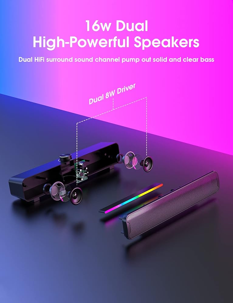 مكبرات صوت بلوتوث V5.3 RGB للابتوب 16 واط ستيريو هاي فاي مزدوج 2.0 مع 6 اوضاع LED ملونة، مكبرات صوت العاب تعمل بمنفذ USB للكمبيوتر المكتبي والجوال واللابتوب والتابلت (تتضمن محول USB C)