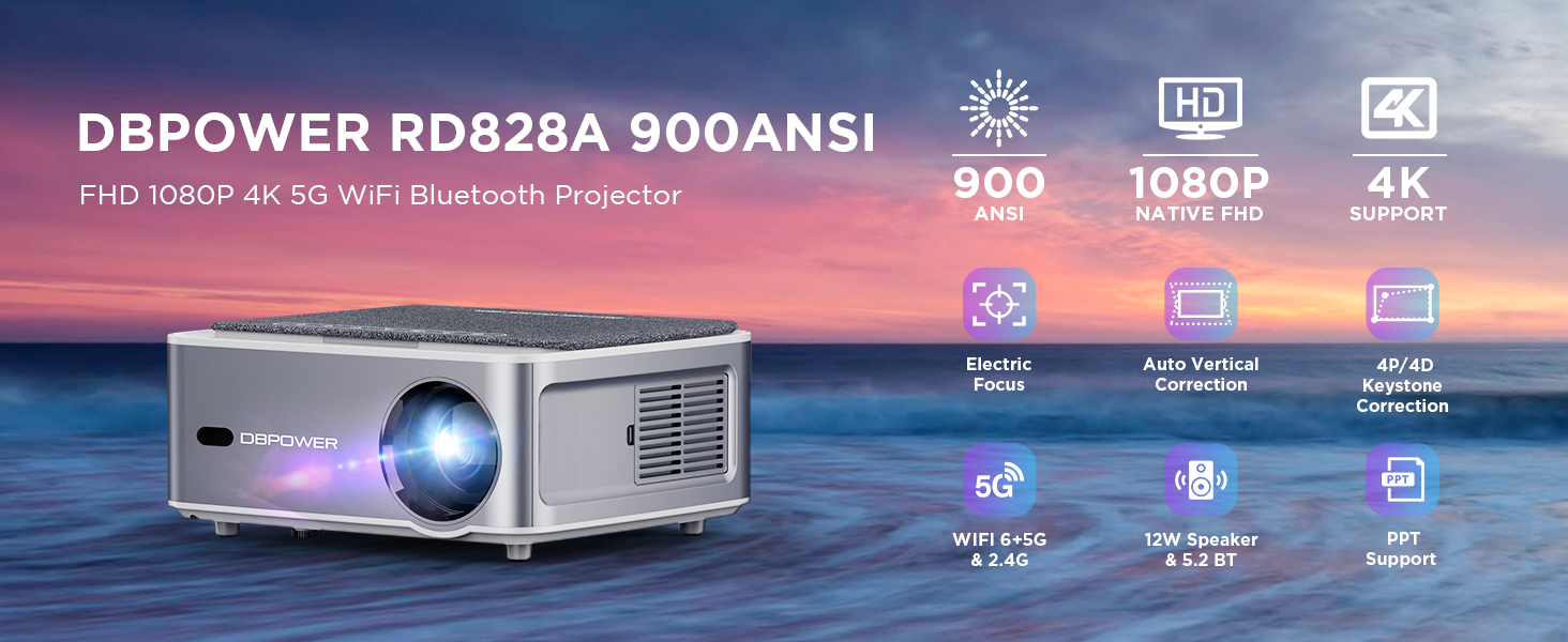 [تركيز كهربائي/تصحيح تلقائي] 900 ANSI Ultra HD، DBPOWER Native 1080P 5G WiFi Bluetooth Projector، HD Outdoor Projector 4K Support، 4P4D/Zoom/PPT، جهاز عرض أفلام صغير محمول للهاتف/الكمبيوتر المحمول/DVD