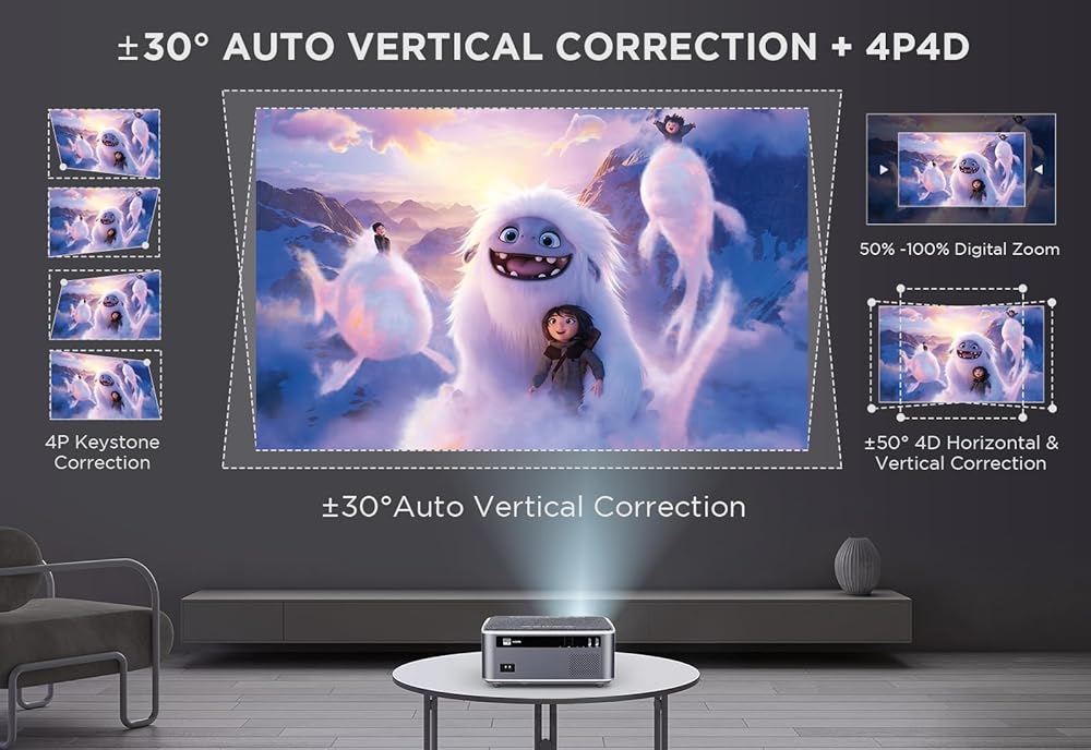 【تركيز كهربائي/±30 درجة تصحيح عمودي تلقائي + 4P4D】جهاز عرض فيلم منزلي DBPOWR مع تركيز كهربائي، جهاز تحكم عن بعد بمفتاح واحد يمكن بسهولة الحصول على صورة واضحة! من خلال تشغيل Keystone Advanced Automatic، يمكن تصحيح جهاز العرض الذكي هذا تلقائيًا عموديًا بمقدار ±30 درجة. بالإضافة إلى تصحيح 4P 4D، يمكن لجهاز عرض الفيديو RD828A ضبط الاتجاه الرأسي أو الأفقي و4 زوايا للصورة يدويًا. فهو يتغلب على الزوايا الناجمة عن قيود الغرفة بعدة طرق ويضفي المرونة على العرض الأمامي/الجانبي/السقفي.