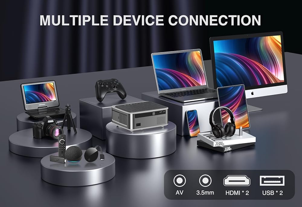 【اتصال واسع، ضمان لمدة 3 سنوات】جهاز عرض الهاتف الذكي DBPOWER 1080p مجهز بمنفذ HDMI*2/USB*2/AV/سماعة الرأس والذي يمكن أن يتوافق بشكل صحيح مع الكروم المصبوب/الهاتف/الكمبيوتر اللوحي/الكمبيوتر الشخصي/الكمبيوتر المحمول/الألعاب وما إلى ذلك لمزيد من المرح. من الترفيه المنزلي الخاص بك. لمشاهدة Netflix وAmazon Prime وHulu، يرجى توصيل جهاز عرض الألعاب هذا بجهاز TV Stick (غير متضمن في العبوة). مدعوم أيضًا بضمان لمدة 3 سنوات، وتتوفر خدمة عملاء احترافية ودعم فني مجاني. اتصل بالبريد الإلكتروني الخاص بنا أولاً في حالة وجود أي مشكلات.