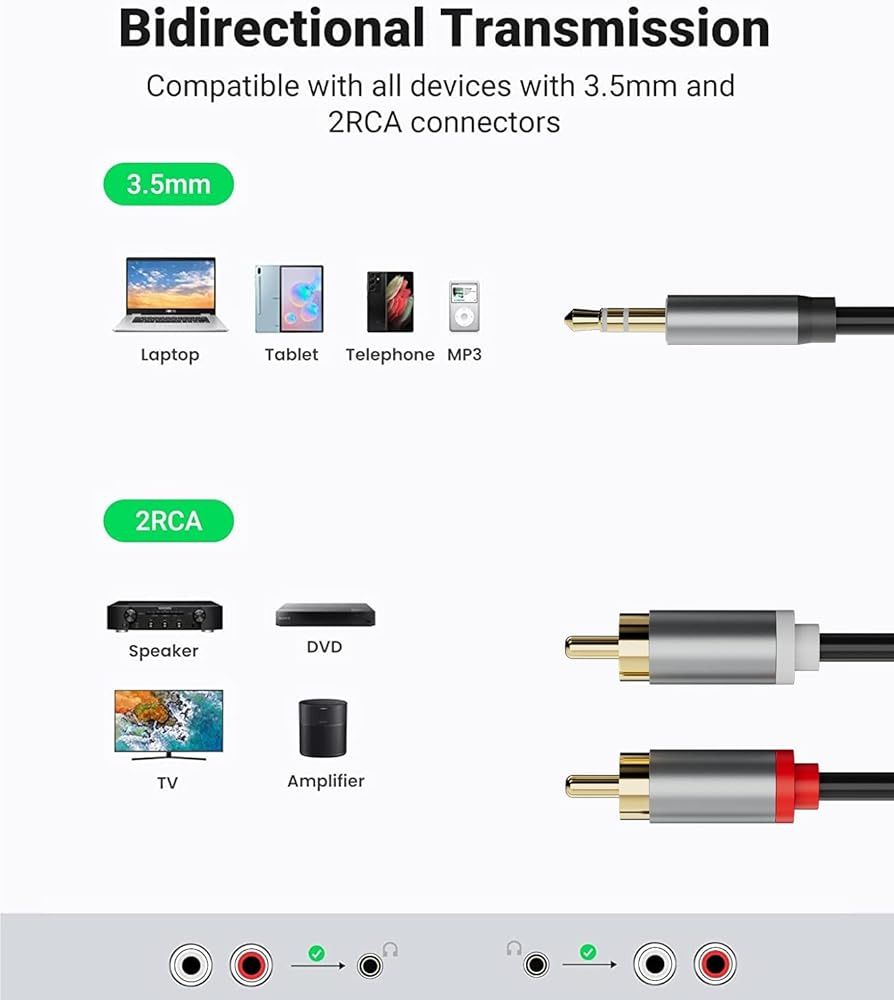 【نقل صوتي ثنائي الاتجاه】 قم بتوصيل الصوت من الهواتف الذكية أو مشغلات MP3 أو الأجهزة اللوحية أو أجهزة الكمبيوتر المحمولة (مع منافذ مساعدة 3.5 مم) إلى مكبر صوت مقبس RCA. أو قم بنقل الموسيقى من DVD (مع مقبس RCA) أو الأجهزة الأخرى التي تدعم RCA إلى مكبر صوت 3.5 مم، ولكن يرجى استبدال المقابس الحمراء والبيضاء عند التوصيل بهذه الطريقة.