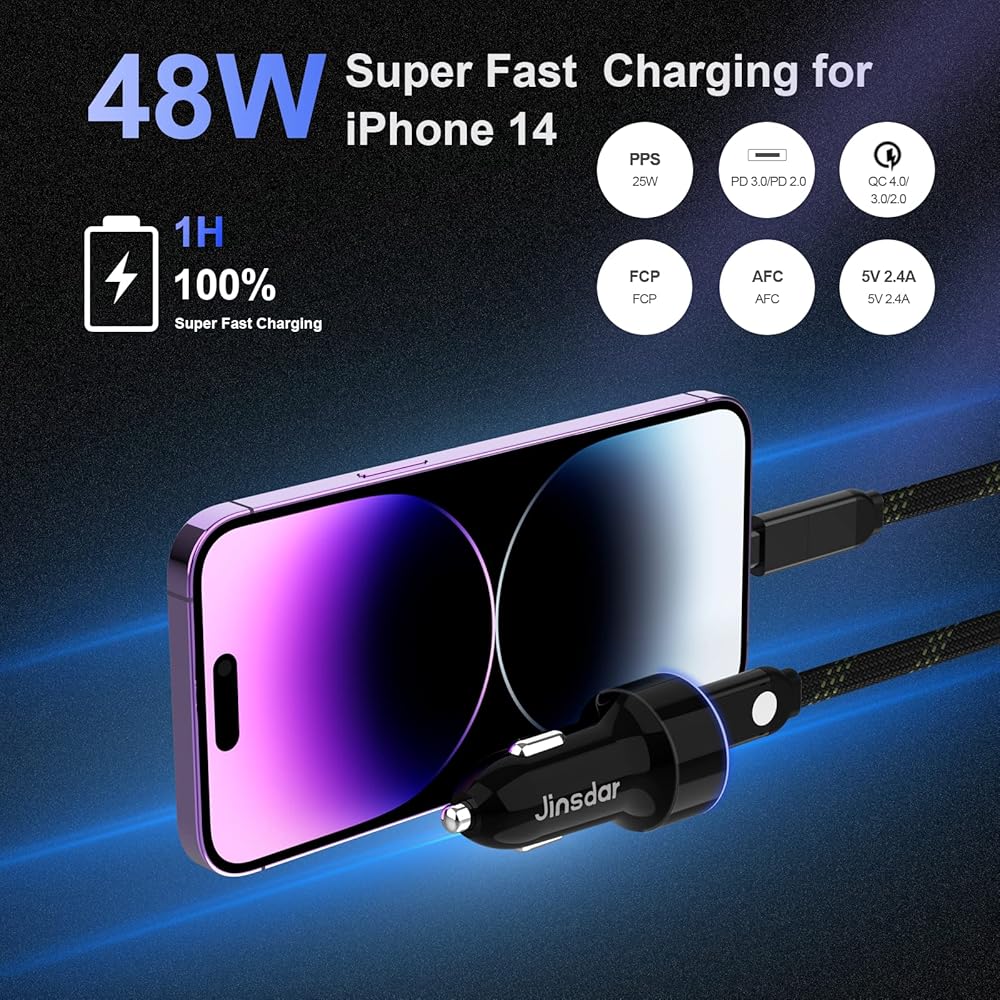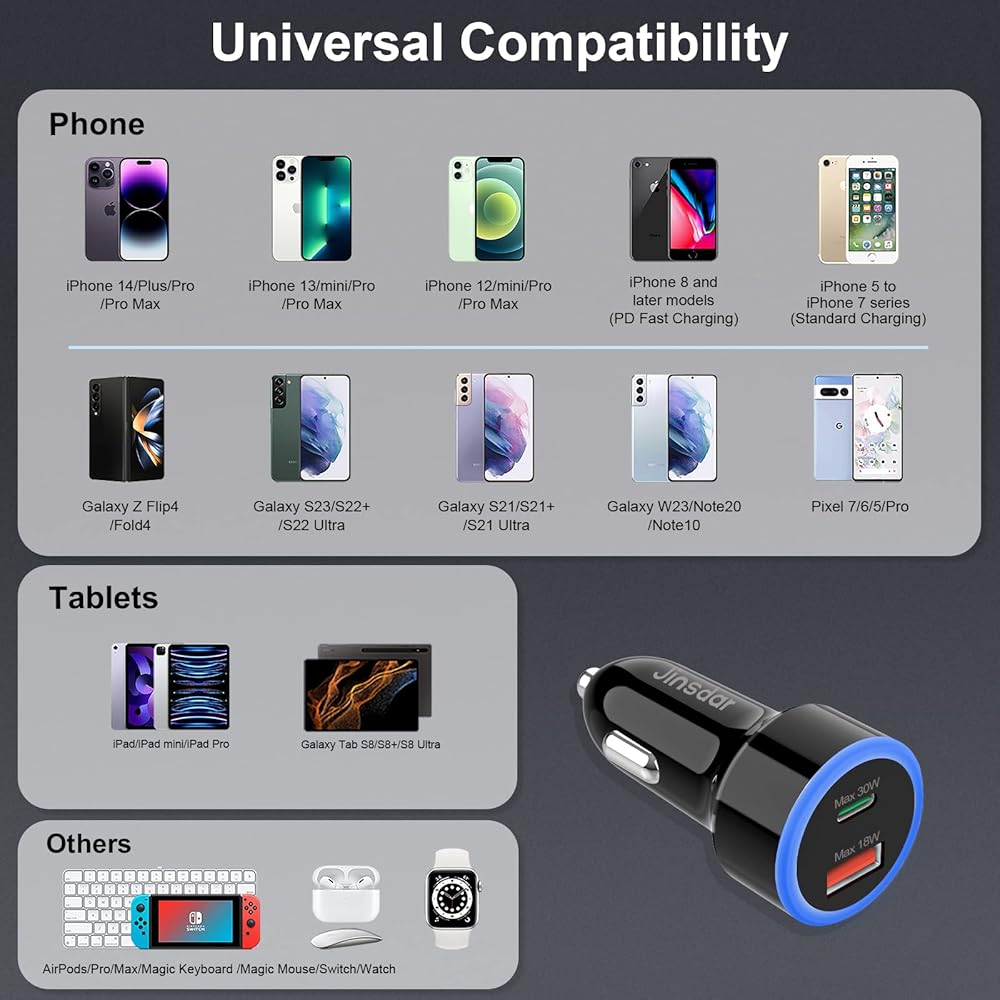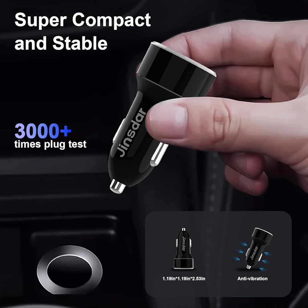 ما تحصل عليه: 1 قطعة شاحن سيارة Jinsdar مزدوج المنفذ (USB-C PD 3.0 وUSB-A QC 3.0)، ضماننا الخالي من القلق لمدة 1.5 سنة، وخدمة عملاء ودية على مدار 24 ساعة/7 أيام.