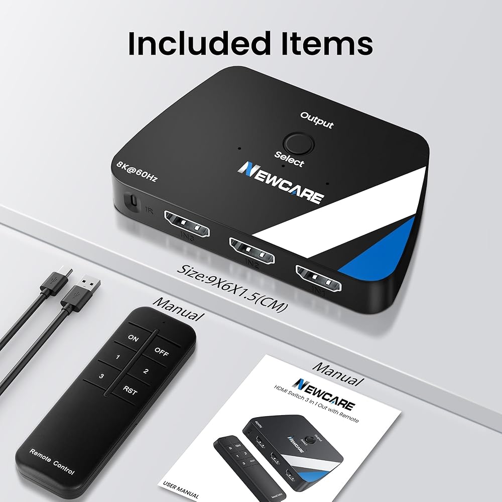 NEWCARE 8K HDMI Switch 3 in 1 Out، HDMI 2.1 Switch مع جهاز تحكم عن بعد، HDMI Splitter 4K @ 120 هرتز يدعم 8K @ 60 هرتز HDCP2.3 HDR10 + VRR ALLM Dolby، محول HDMI متوافق مع التلفزيون PS5/4 Xbox أجهزة الكمبيوتر المحمولة جهاز عرض الكمبيوتر