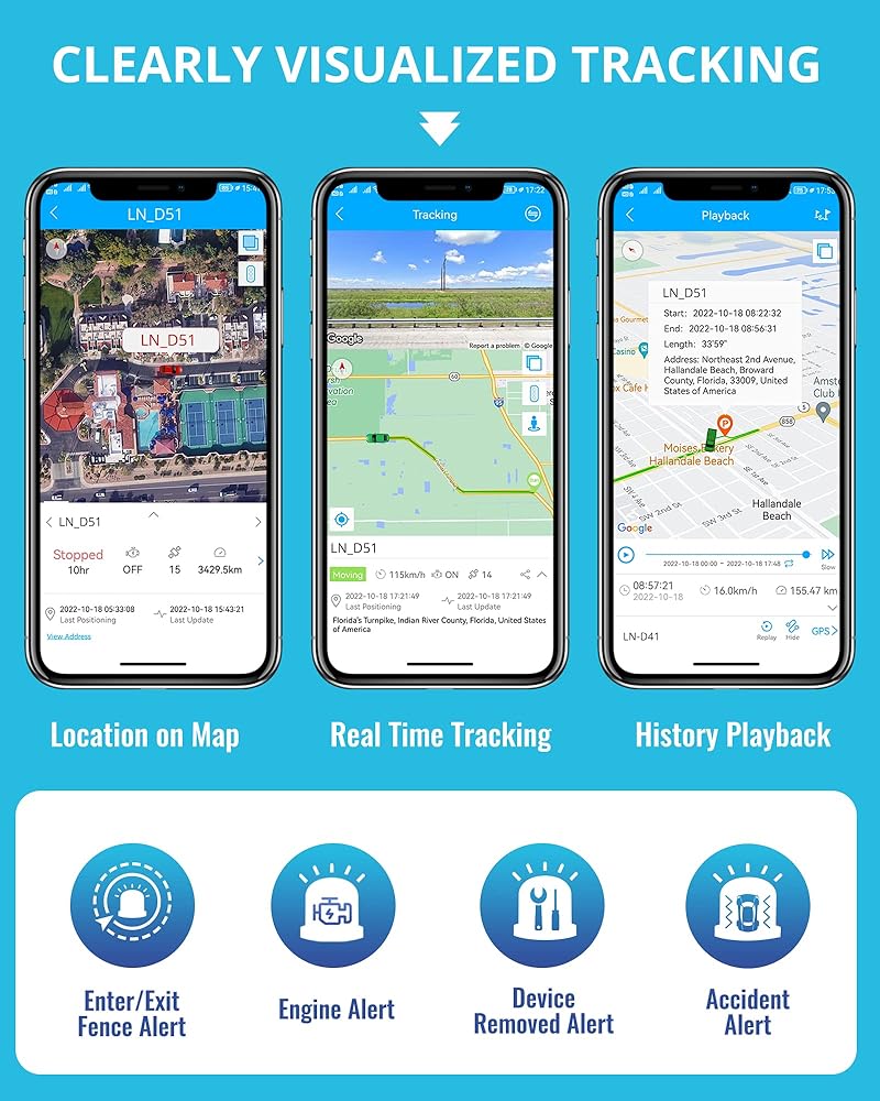 يشتمل جهاز تعقب السيارات LNCOON D51 على نظام تتبع GPS في شاحن السيارة. مع توفير منفذ شحن سريع USB وType C، يسمح لك جهاز تعقب GPS بالتحقق من الموقع في الوقت الحقيقي وحالة المحرك والسرعة والمسافة المقطوعة دون وعي السائق. سجل رحلة التاريخ مع علامة التوقف ومواقف السيارات، وأجهزة الإنذار المتعددة.