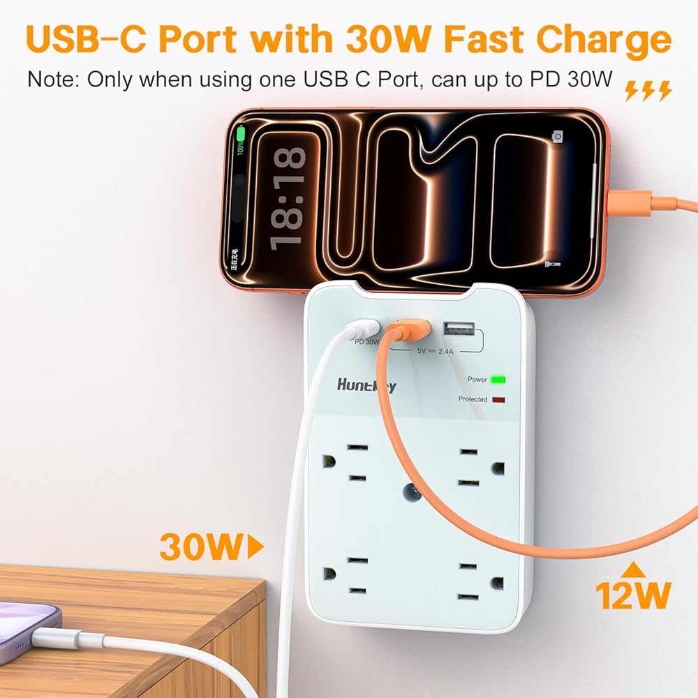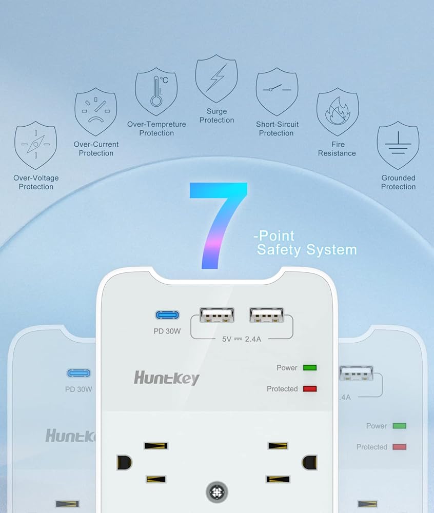 【آمنة ومتينة】محمية من جميع النواحي، ومواد مقاومة للحريق، وحماية من الحمل الزائد، وقضيب نحاسي متكامل. شريط الطاقة الواقي من زيادة التيار من Huntkey مدرج في قائمة ETL ومعتمد من لجنة الاتصالات الفيدرالية (FCC).