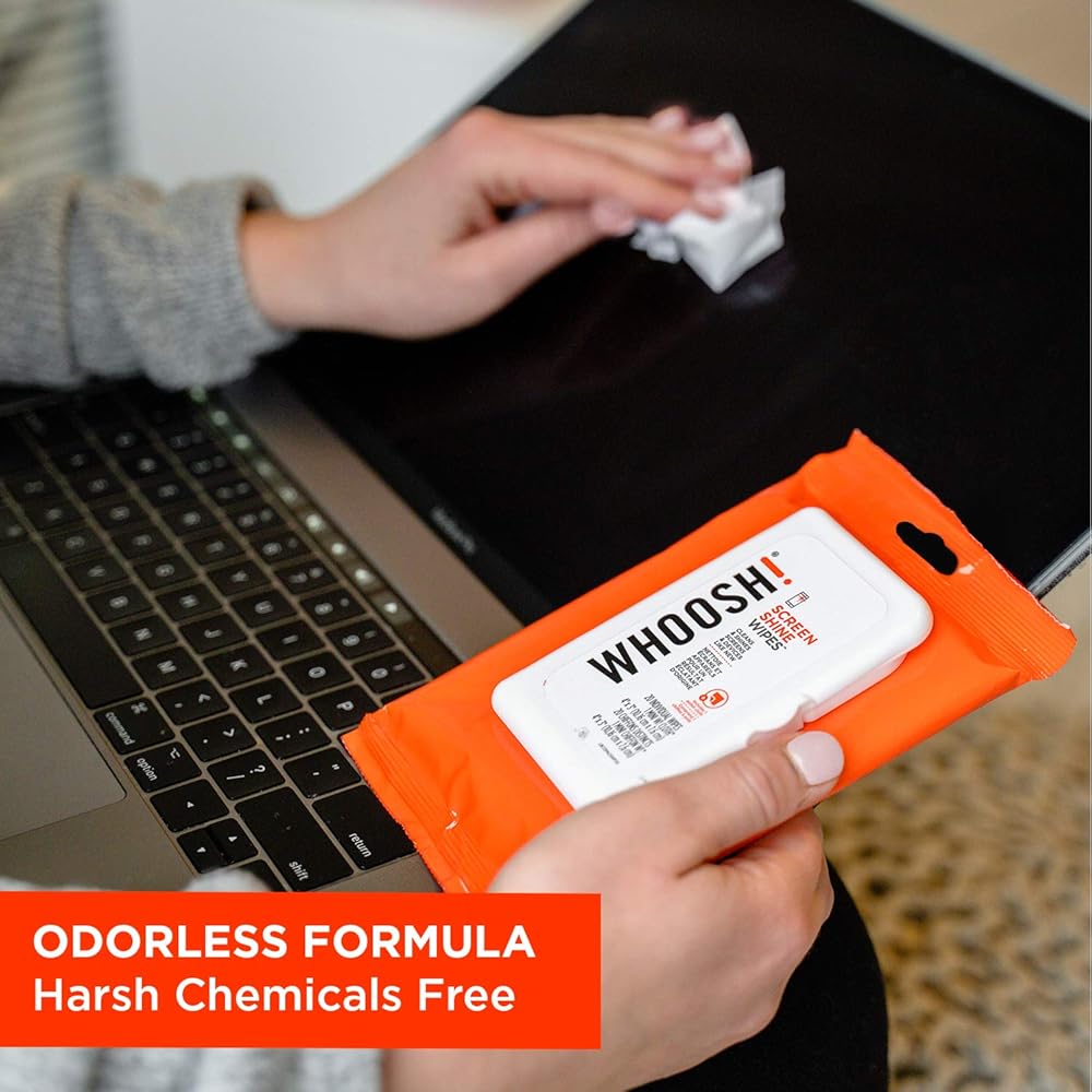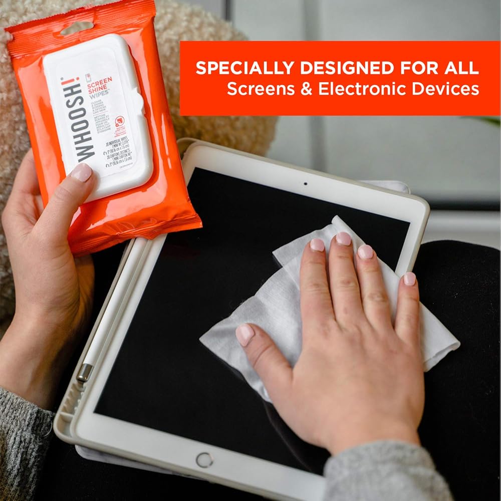 ووش! مناديل الكترونية لتنظيف الشاشة - لجميع الشاشات والاجهزة التقنية؛ الهواتف الذكية، ايباد، نظارات النظارة، القراء الالكتروني، الشاشات التي تعمل باللمس والتلفزيونات (20 قطعة مع قطعة قماش صغيرة)