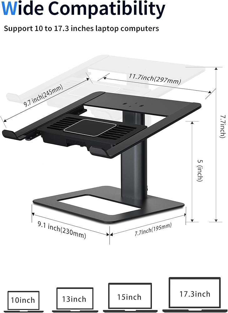 متوافق مع أجهزة اللاب توب من 10 إلى 15.6 بوصة ➤ متوافق مع أي لاب توب مقاس 10-17.3 بوصة، مثل ماك وماك بوك اير وماك بوك برو ومايكروسوفت سيرفس واتش بي وجوجل بيكسل بوك وديل اكس بي اس واسوس ولينوفو وايسر وكروم بوك والين وير وما إلى ذلك. تصميم متين من الألومنيوم يضمن ثباتًا قويًا لحمل اللاب توب حتى 20 باوند.