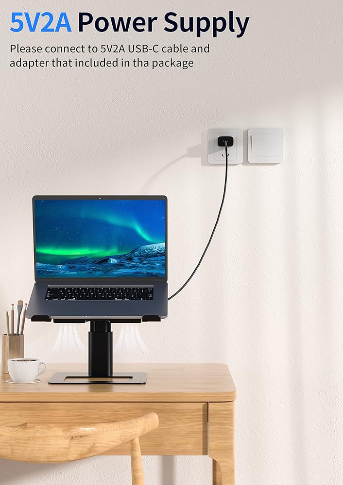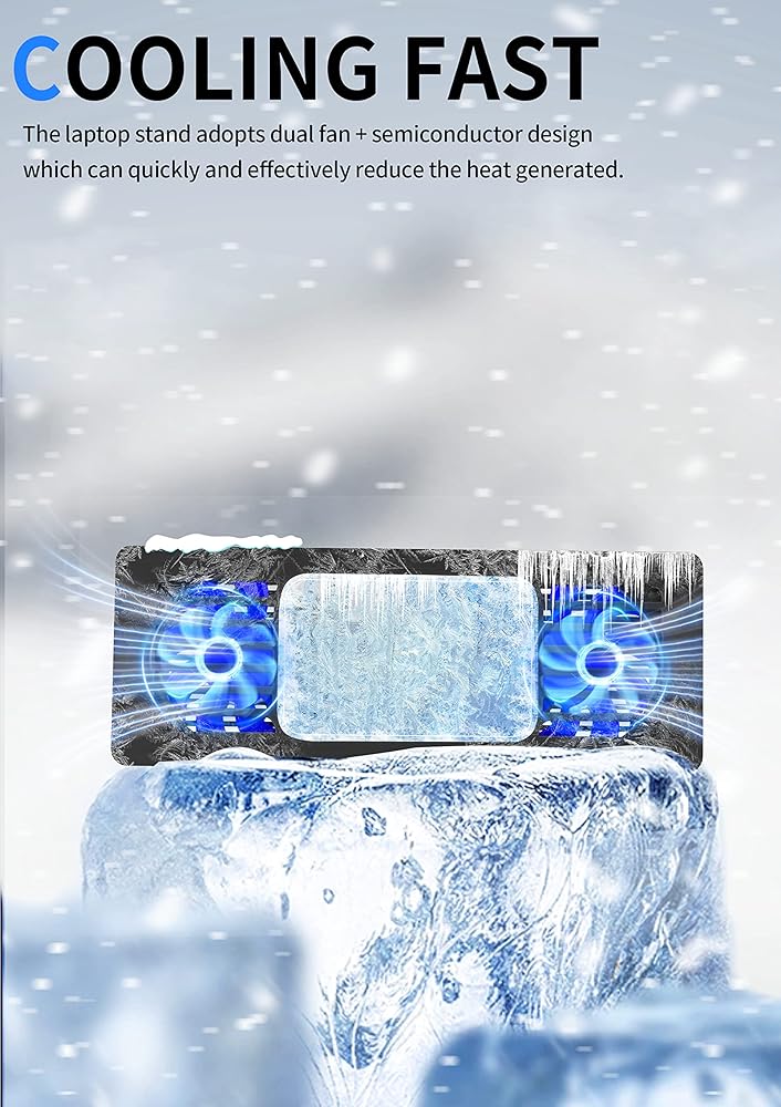 تبريد سريع ➤ تساعد مادة خليط الألومنيوم على تبديد الحرارة بسهولة. علاوة على ذلك، يعتمد حامل اللاب توب على مروحة مزدوجة وتصميم رقائق تبريد شبه موصلة، والتي يمكن أن تقلل الحرارة المتولدة بسرعة وفعالية.