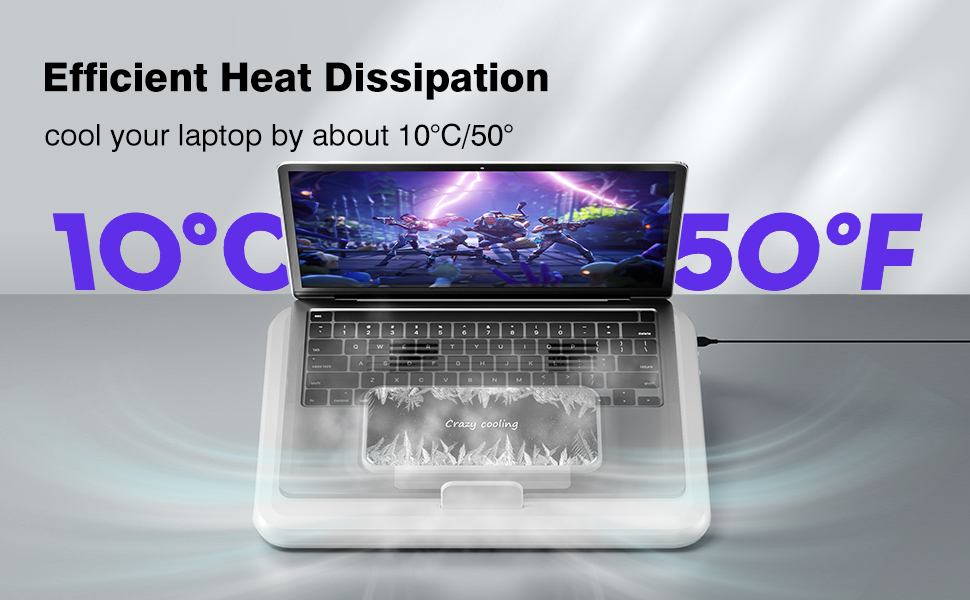 Innovative Semiconductor Design - Dlinda adopts metal semiconductor refrigeration module for upgraded cooling effect, only take 60s to reach ice-cold, it's elastic mechanism makes any laptop tightly fit. Work with fans together can cool your laptop by about 10 C/50 F.