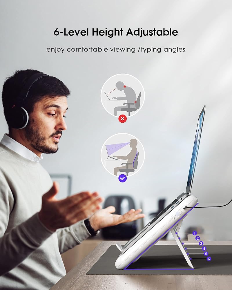 Ergonomic Comfort - 6-level height adjustable options, enjoy ergonomic angle for a comfortable viewing/typing experience. Rubber baffle and bracket feet firmly support your laptop without slipping, not only an effective cooling pad but also as a stable laptop stand.