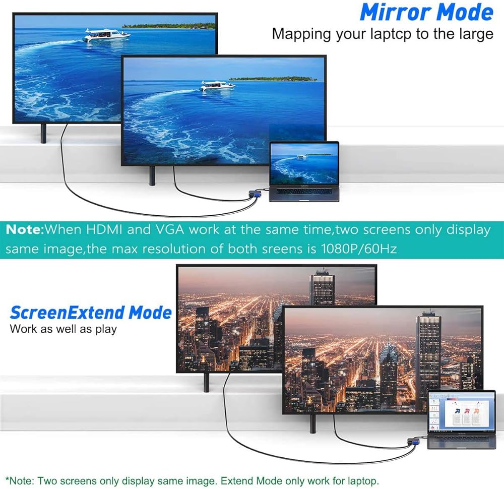 • 【محول USB C إلى HDMI VGA】منفذ HDMI يدعم الحد الأقصى 4K UHD 3840×2160@30 هرتز؛ شاشة VGA بدقة تصل إلى 1080P@60 هرتز Full HD. عندما يعمل منفذين في وقت واحد، تكون الدقة القصوى للمنفذين هي 1920 × 1080 بكسل عند 60 هرتز. ملاحظة: وضع التمديد، بينما يعمل vga وhdmi في نفس الوقت، تظهر شاشتان خارجيتان نفس المحتوى فقط. (لا تدعم شاشتين لعرض محتوى مختلف بشكل منفصل، فقط يمكن تكرارهما)