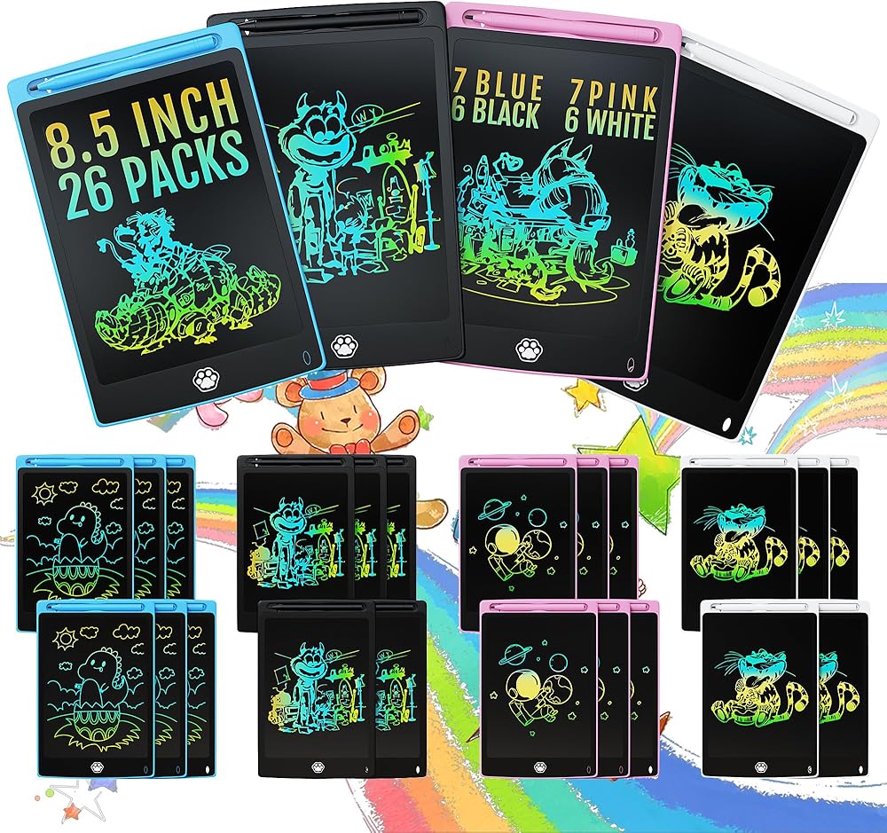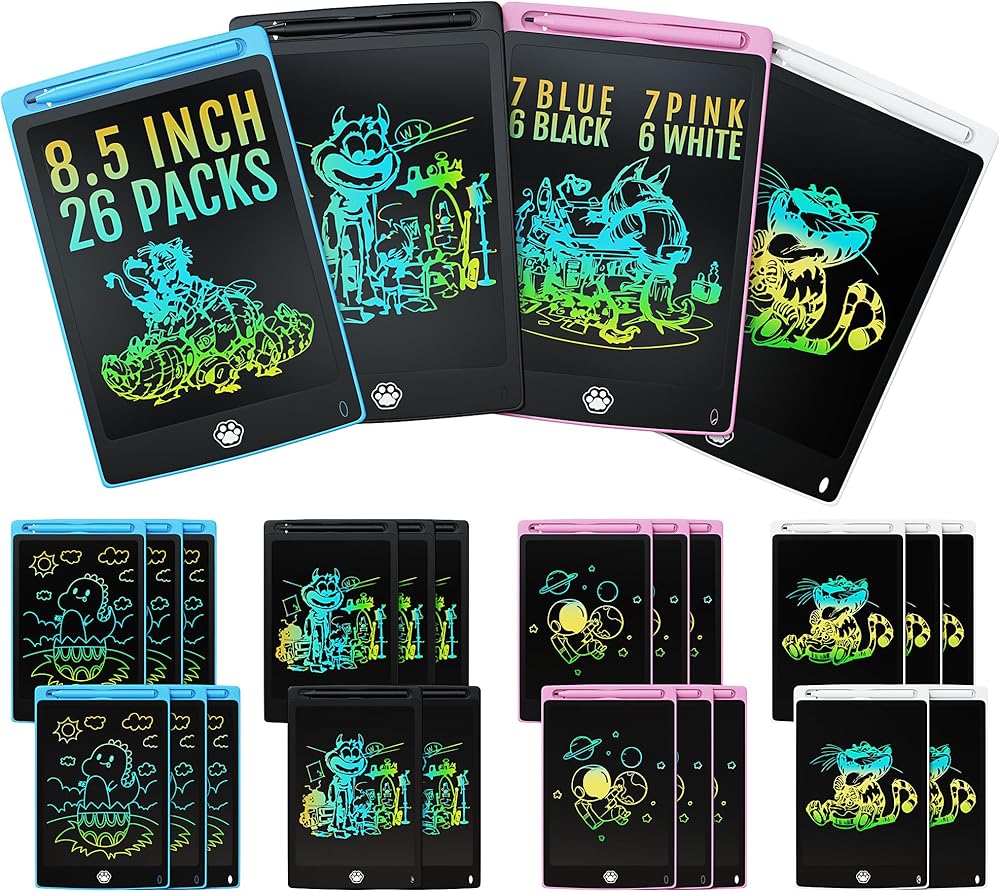 【4 عبوات من أجهزة الكمبيوتر اللوحية للكتابة LCD】4* أجهزة لوحية للكتابة LCD، 4*ملصقات ملونة، 4*بطارية احتياطية، 4*حبل قلم، 1*مفك براغي. يستخدم لوح الرسم تقنية حساسة للضغط، ويمكنه إنشاء خطوط باستخدام قلم أو أي جسم صلب، ويعتمد سمكها على مدى قوة الدفع.