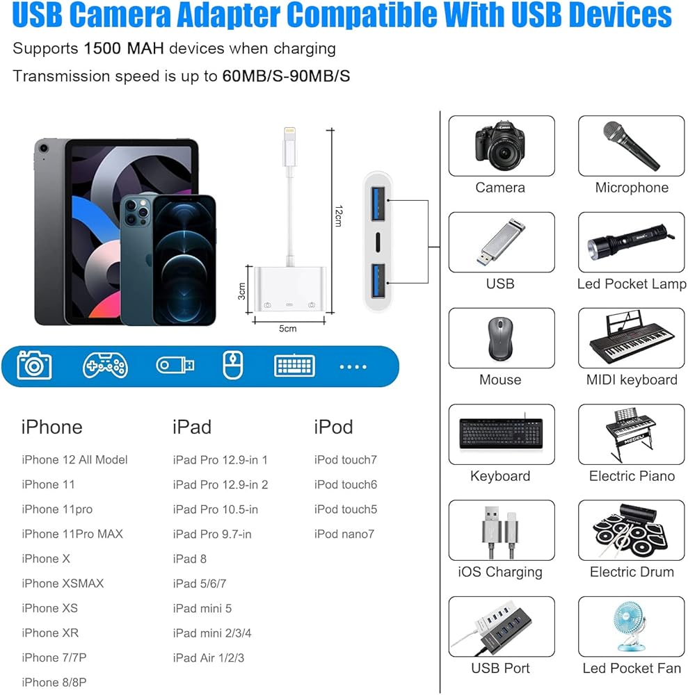 - الأجهزة غير المتوافقة مع محول USB: القرص الصلب والطابعة والمسجل ومقبض الألعاب ومسدس الكسح وواي فاي محمول ومحول بلوتوث وصندوق الصوت وما إلى ذلك. (لا يدعم محول ايفون إلى USB هذا أجهزة USB التي تزيد عن 1500 مللي أمبير، يرجى التحقق من تيار أجهزتك.)