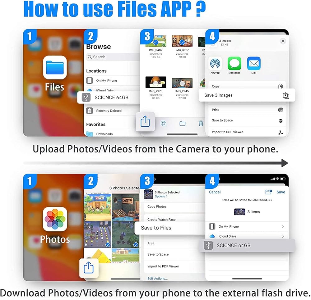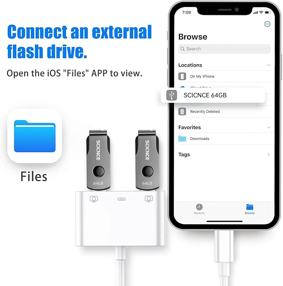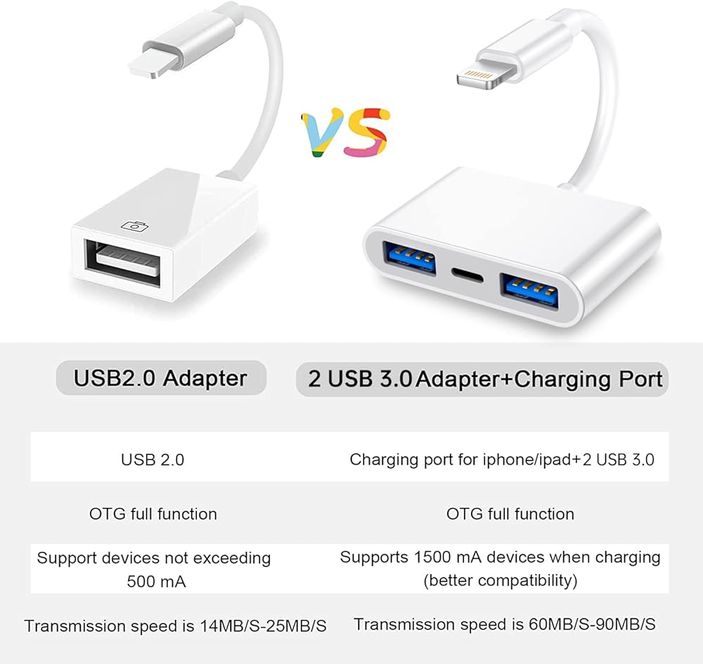 ✔ استيراد وتصدير الصور/الفيديو/الملفات/الصوت: محول او تي جي للكاميرا يو اس بي المزدوج هذا أكثر ملاءمة لنقل الصور ومقاطع الفيديو من الكاميرا إلى ايفون وايباد. بالنسبة لنظام اي او اس 9.2-13، يدعم نقل الفيديو في اتجاه واحد. بالنسبة لنظام التشغيل iOS 13 والإصدارات الأحدث، يمكنه استيراد وتصدير نقل الصور والفيديو وملفات MP3 وإكسيل وورد وPPT وPDF عن طريق فتح تطبيق "الملفات".