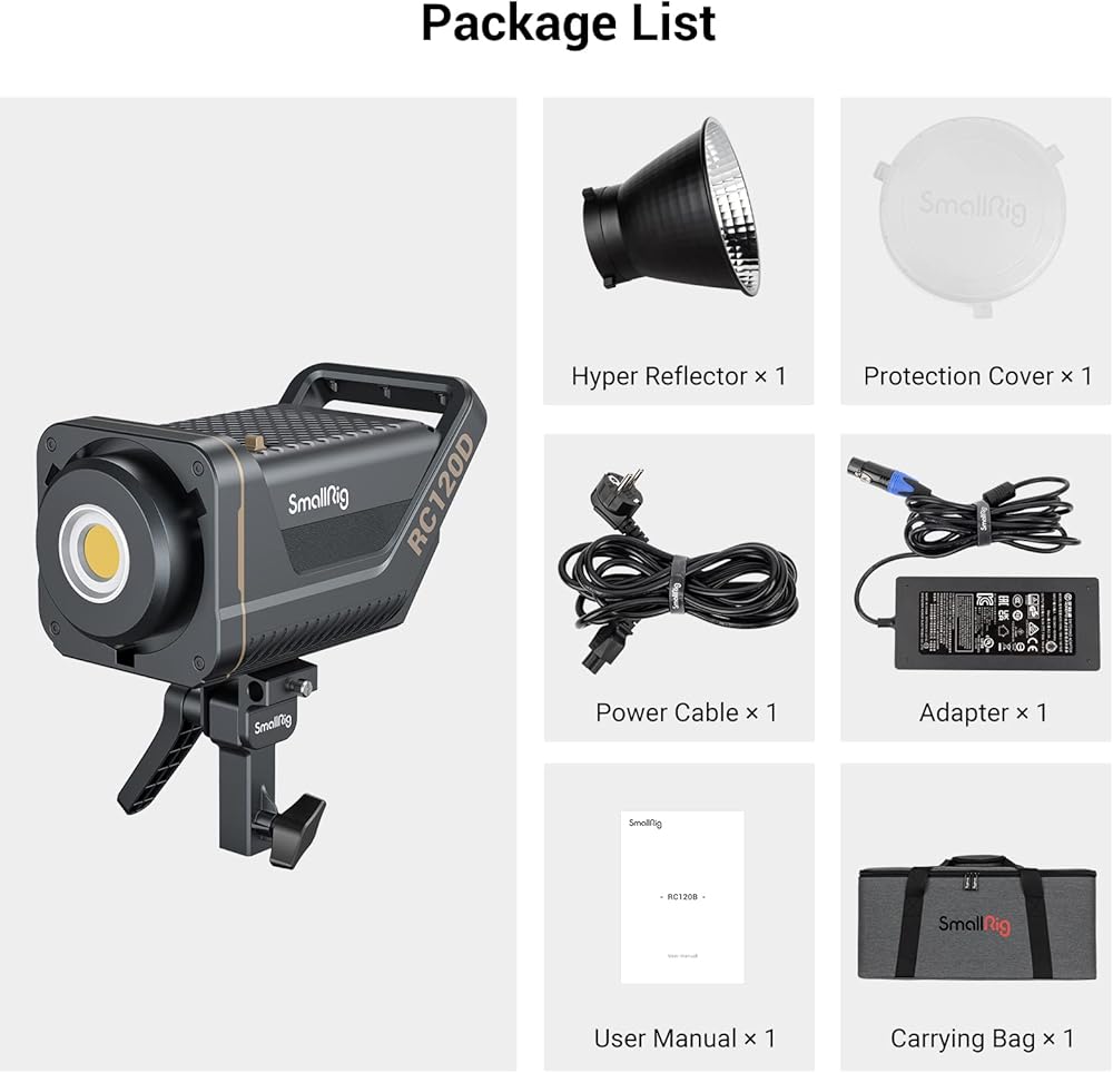 تتضمن العبوة: تلتزم مصابيح الفيديو SmallRig بتقديم خدمة أفضل. بالإضافة إلى ملحقات إضاءة الفيديو الشائعة، فإننا نوفر أيضًا حقيبة حمل (لا توفرها معظم العلامات التجارية). تتضمن العبوة: ضوء RC 120D × 1، عاكس مفرط × 1، محول تيار متردد × 1، كابل الطاقة × 1، حقيبة حمل × 1 (حجم الحقيبة: 500 × 260 × 220 مم).