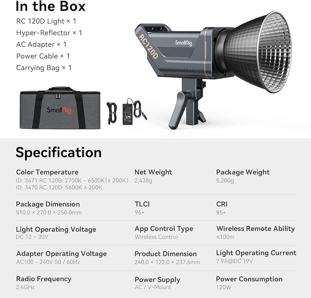 إضاءة LED عالية السطوع: يمكن أن يوفر الضوء 120 وات 5,370 لوكس @ 1 متر (3.3 قدم) بدون العاكس و62,600 لوكس @ 1 متر (3.3 قدم) مع العاكس الفائق (تشمل العبوة)، في حين أن مصابيح الفيديو العادية الأخرى 100 وات ~ 150 وات يمكن أن تصل فقط 34,300 لوكس عند 1 م. إنه ضوء مستمر رائع لمقاطع فيديو يوتيوب والبث المباشر والاستوديو والتقاط الصور وما إلى ذلك.