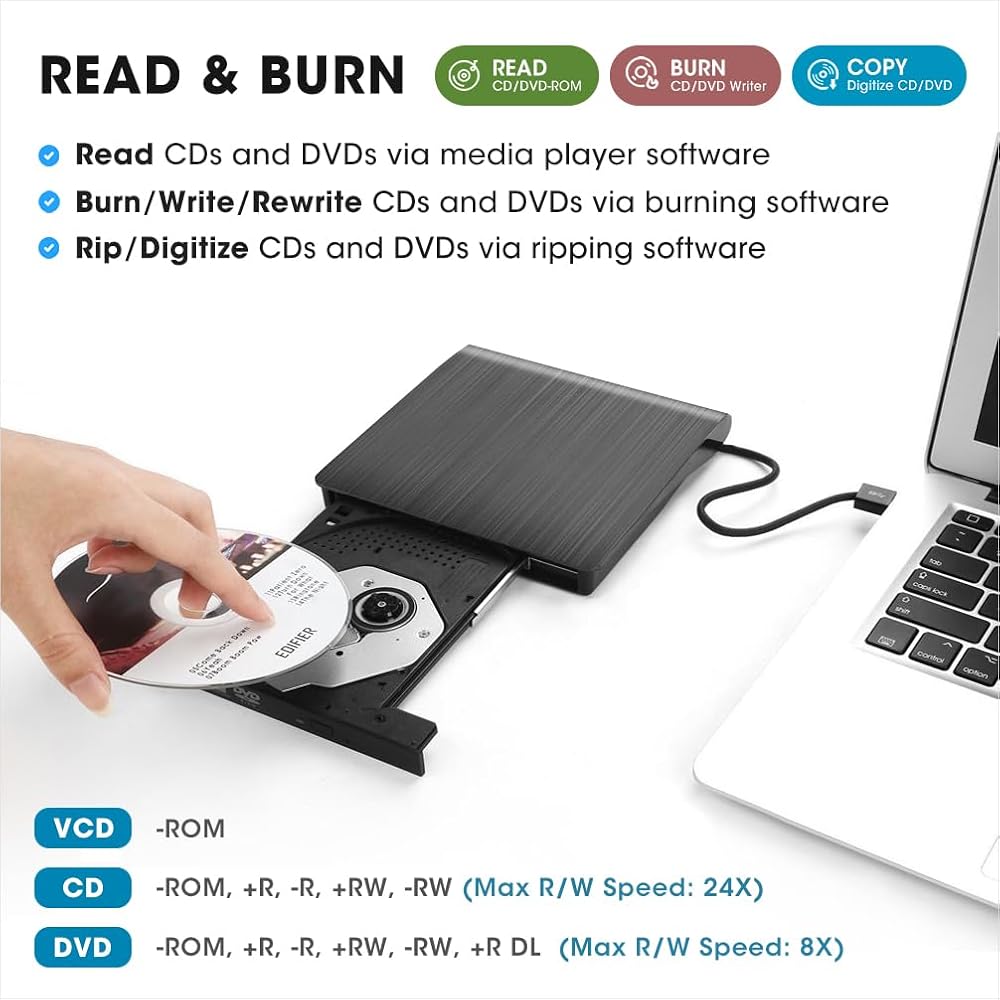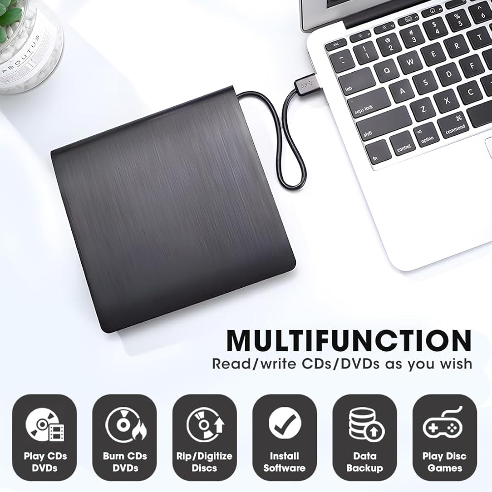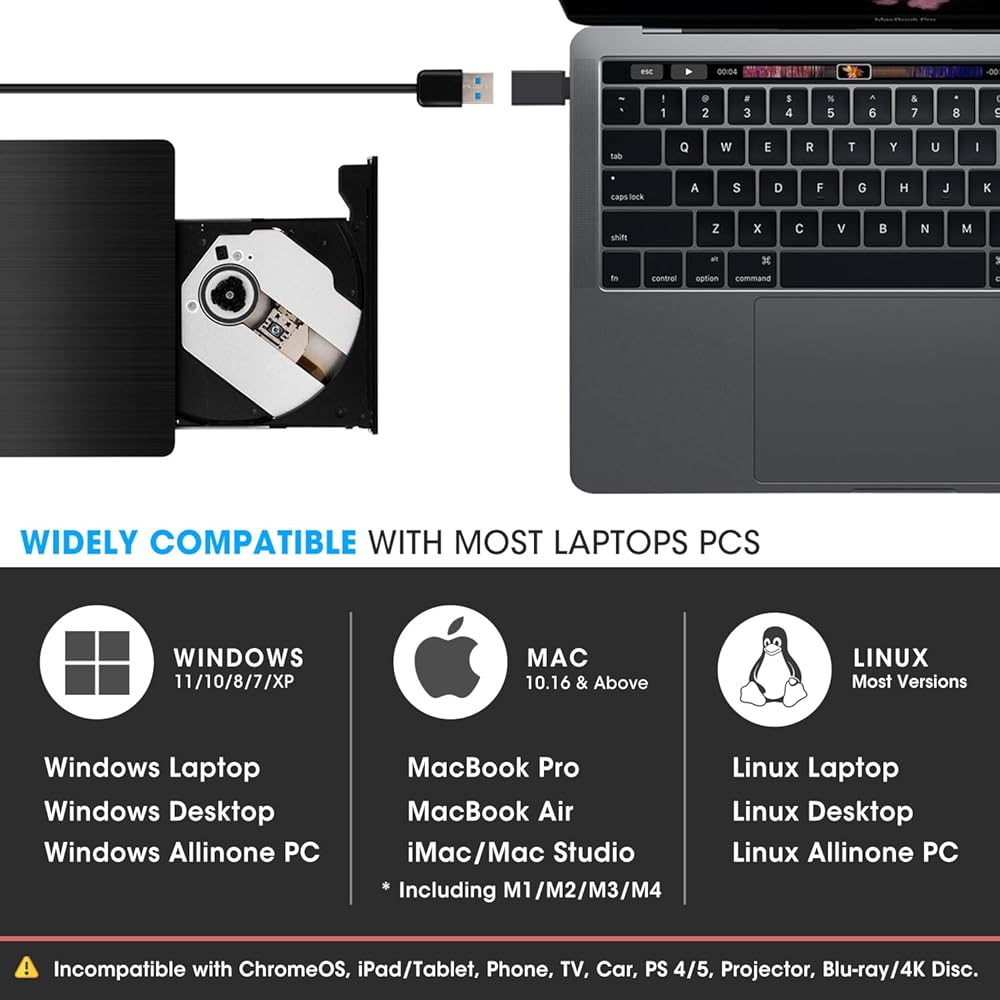 • 【متوافق مع أنظمة تشغيل متعددة】متوافق مع أنظمة التشغيل Windows 11/ 10/ 8.1/ 7/ XP وLinux وجميع إصدارات نظام التشغيل Mac OS، لذلك يمكنك استخدام محرك الأقراص الضوئية الخارجي هذا على جميع أجهزة الكمبيوتر تقريبًا بما في ذلك MacBook Pro وMacBook Air وiMac و أجهزة الكمبيوتر المحمول وأجهزة الكمبيوتر المكتبية التي تعمل بنظام Windows (ملاحظة: لا تدعم أجهزة Chromebook والتلفزيون وiPad والشاحنات والسيارات).