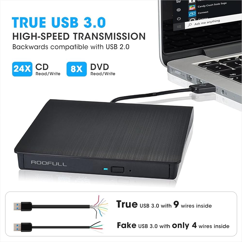 احصل على قارئ USB3.0 CD/DVD عالي السرعة وكاتب وناسخ، ويمكنك الاستمتاع بالأفلام والموسيقى ونسخ الأقراص وتثبيت البرامج وإنشاء أقراص احتياطية والمزيد على الكمبيوتر المحمول أو سطح المكتب الخاص بك مع نظام التشغيل Windows 11/ 10 / 8 / 7 / XP ونظام التشغيل Mac10.