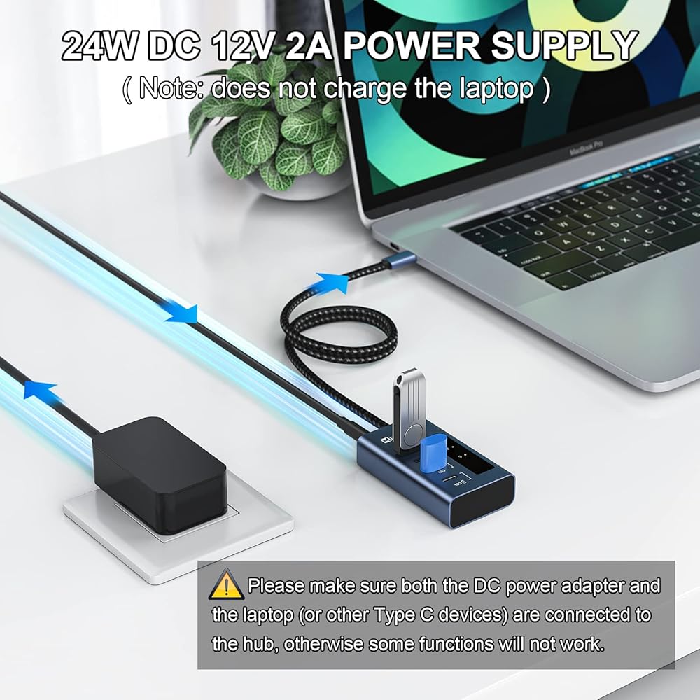 موزع USB C يعمل بالطاقة Minisopuru، مقسم USB C 7 في 1 يدعم البيانات السريعة والشحن السريع (لا يدعم الفيديو)، ومفاتيح تشغيل/إيقاف فردية، ومحول طاقة 36 وات لأجهزة MacBook Pro/Air، وiMac، وiPad، والهاتف، إلخ.
