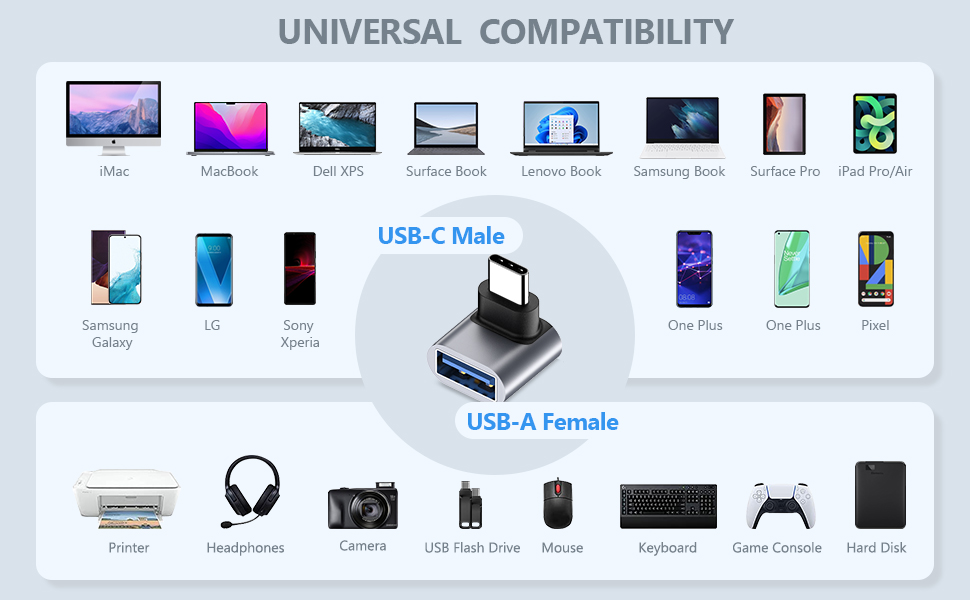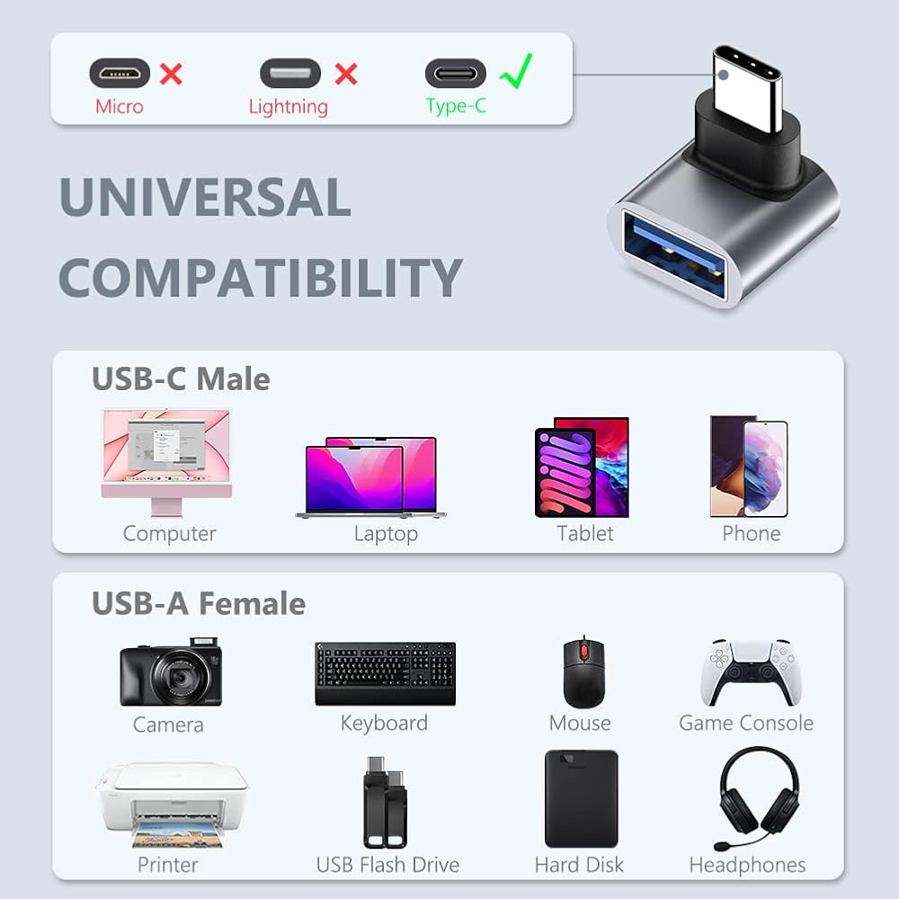• توافق واسع: يقوم هذا المحول من النوع c بتحويل منفذ USB-C إلى منفذ USB لتوصيل أي جهاز USB قياسي مثل كابل USB، والقرص الصلب الخارجي، وقارئ البطاقات، والماوس، ولوحة المفاتيح، وكاميرا الويب، والكاميرا، والطابعة، ووحدة التحكم في الألعاب، ولوحة مفاتيح midi إلى جهاز الكمبيوتر أو الكمبيوتر المحمول أو الجهاز اللوحي أو الهاتف الذكي المزود بمنفذ USB C (Thunderbolt 3/4)، مثل Macbook Pro 2021/2020/2019/2018/2017/2016، وMackBook Air 2021/2020/2019/2018، وiPad Pro 2021/2020/ 2018، iPad Air 5/4، Dell XPS 17/15/13، Surface Go، Samsung S22/Note 20 وغيرها