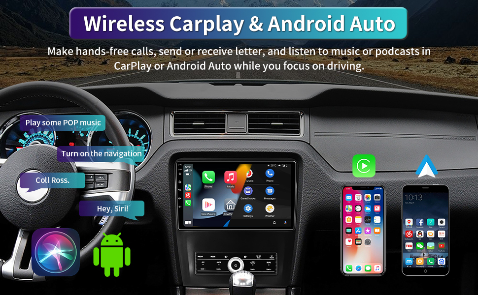 【تشغيل لاسلكي وAndroid Auto】تشغيل لاسلكي ووظيفة Android Auto، لا حاجة لتوصيل كابل USB، ودعم استخدام المساعد الصوتي الذكي أو لمس الشاشة، يمكنك الحصول على الاتجاهات، وإجراء المكالمات، وإرسال واستقبال الرسائل، والاستمتاع بالموسيقى وما إلى ذلك. طريقة أكثر ذكاءً وأمانًا ومتعة لاستخدام هاتفك في السيارة، والحفاظ على تركيزك واتصالك وترفيهك. الآن يمكنك الاستمتاع بجميع مزايا هاتفك دون إبعاد عينيك عن الطريق.