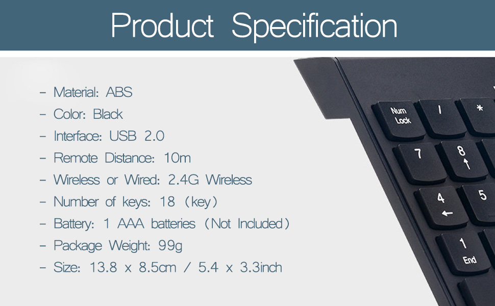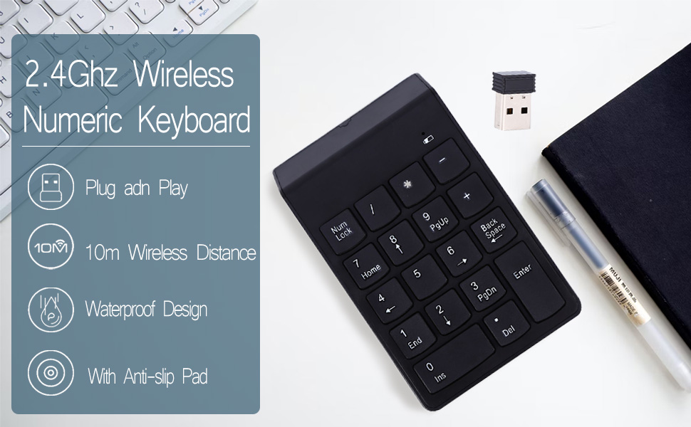 تعد لوحة المفاتيح الرقمية اللاسلكية 2.4 جيجا ضرورية إذا كنت ترغب في اتصال لاسلكي خالٍ من الفوضى. تصميم خفيف الوزن وصغير الحجم يجعله لطيفًا وعمليًا. أدخل وضع السكون إذا لم يتم إجراء أي عملية لفترة طويلة، موفر للطاقة ومقتصد. اختيار مثالي لك!