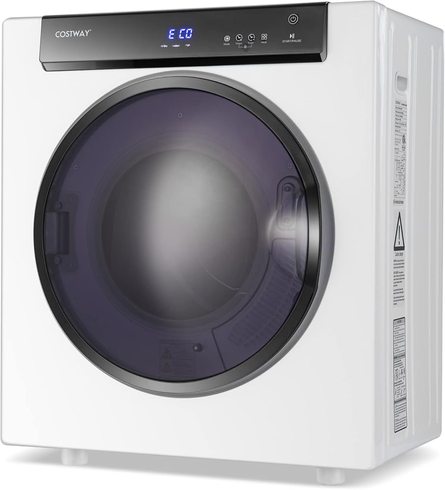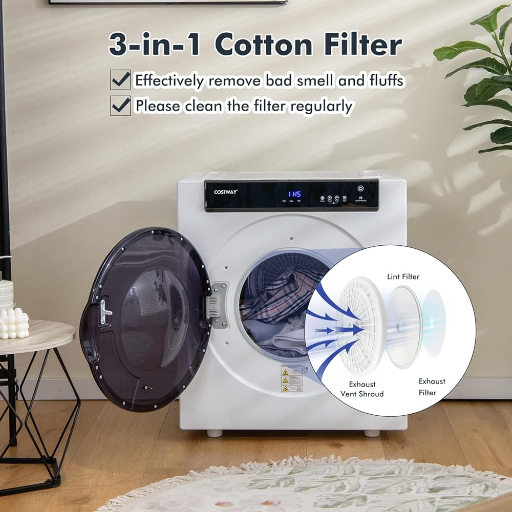 【Efficient Performance: 】With 8.8 lbs laundry capacity, this front load portable clothes dryer can dry different kinds of clothes of the whole family. With its 1400W power and 149℉ maximum temperature, this laundry dryer drys your clothes evenly and quickly.