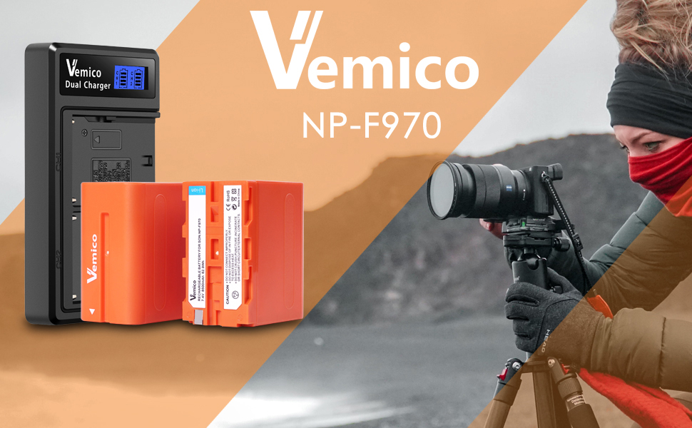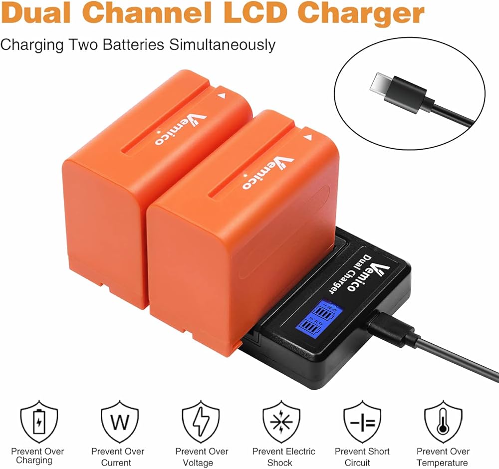 طقم شاحن بطارية NP-F970 مطور من Vemico بطاريات بديلة 2 × 8500 مللي أمبير في الساعة مع شاحن LCD من النوع C لسوني NP F970/F960/F530/F550/F570/F730/F750/F770/F930/F950/HDR-FX1/TR516/TR716