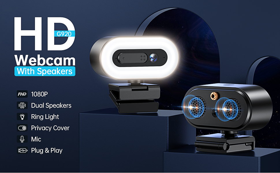 جوسجو كاميرا ويب G920 FHD 1080P مع ميكروفون ومكبرات صوت، كاميرا بث مع ضوء حلقي، كاميرا كمبيوتر للتوصيل والتشغيل، غطاء للخصوصية، كاميرا ويب للكمبيوتر المكتبي/اللابتوب/ماك