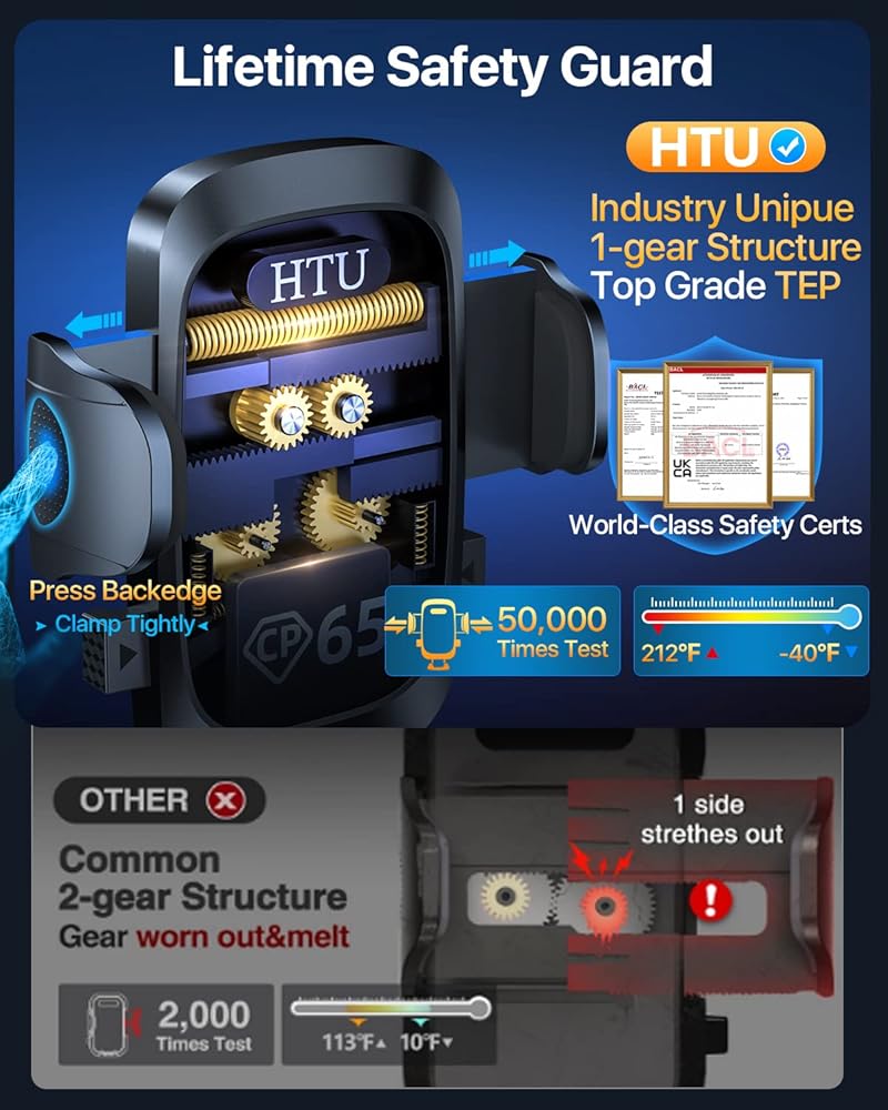 • 📢【الخيار الأفضل: حامل سيارة متطور موثوق به من قبل أكثر من 2,500,000 مستخدم أكثر من 15 عامًا】حامل هاتف السيارة 2023 HTU معتمد من جميع السلطات (شهادة مقاومة الصدمات من الدرجة العسكرية الدولية، CP65، REACH، RoHS...)، بناءً على فريدة من نوعها تصميم Grandmaster (براءة اختراع EUIPO)، مواد متينة وصحية من أكثر من 4,000 مادة واختبارات سلامة رائدة في الصناعة (شهريًا أكثر من 5,000 اختبار فتح/إغلاق؛ 10,000+ مقاومة للاهتزاز؛ 100,000+ كم اختبارات الطرق الوعرة؛ -40 درجة فهرنهايت إلى 203 درجة ف الفحص المعملي...)
