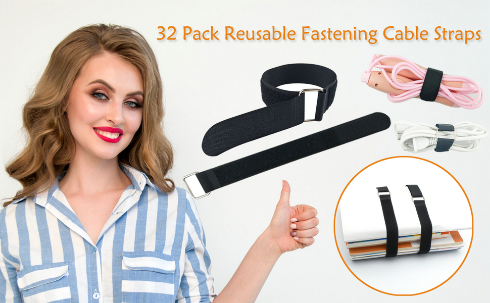 مجموعة اربطة كيبلات قابلة لاعادة الاستخدام مكونة من 32 قطعة (8 انش - 12 انش - 18 انش - 26 انش - 32 انش)، اشرطة تثبيت بخطاف متعددة الاغراض قابلة للتعديل مع مشبك معدني للحفاظ على الاسلاك منظمة ومرتبة