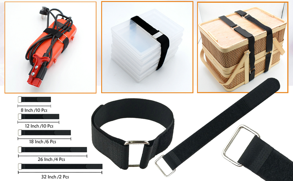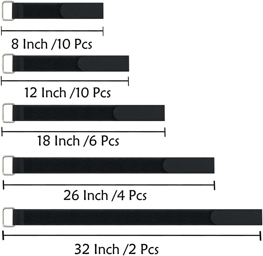 32 حزمة من الأشرطة المتنوعة ذات قيمة فائقة: لتناسب احتياجاتك الدقيقة، تأتي الحزمة في 5 مقاسات الأكثر شعبية. تحتوي كل مجموعة من ربطات التثبيت على 10 قطع 8 انش × 10 قطع، 12 انش × 10 قطع، 18 انش × 6 قطع، 26 انش × 4 قطع، 32 انش × 2 قطعة من ربطات الكابلات متعددة الأغراض بخطاف وحلقة. تتضمن حلقة معدنية على شكل حرف D في الذيل، يمكن دمج شريطين أو أكثر معًا لتمديد أطوالهما لتلبية احتياجاتك الخاصة.