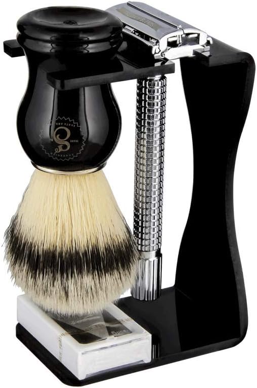 Shaving brush, safety razor, stand and 5 razor blades included.
