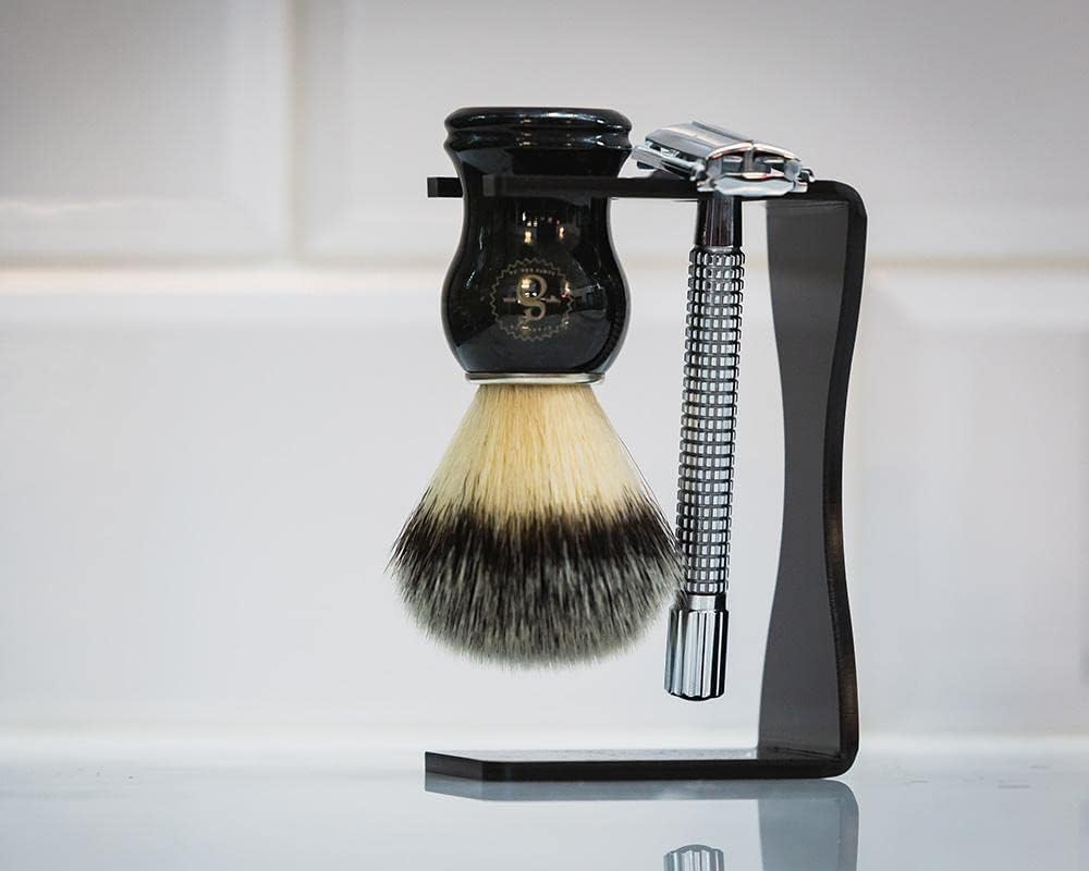 Step up your shaving game right away with our Wet Shave Set for home use. Make that daily ritual so much more pleasing, healthier and rewarding. The benefits of using a safety razor and brush are numerous and vast. It will not only help you to achieve a closer and better shave but it will do it in the least damaging way possible for your face and skin. Directions: Wet brush and apply to shaving cream in bowl or hand. Whip to a rich lather. Apply to warm and damp face. Use small circular motions against skin to work in product. Use safety razor to shave. Apply more shaving cream as needed. After your shave rinse tools and use stand to hang brush and razor to drip dry completely.